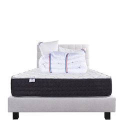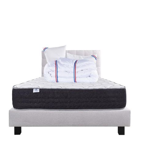 Ce matelas allie le meilleur des deux mondes : des ressorts ensachés durables pour un soutien exceptionnel et une mousse de haute qualité pour un confort incomparable. Nous avons souhaité le combiner avec une couette de 450g avec une très bonne régulation thermique, elle possède un bon gonflant avec un toucher soyeux. Ainsi qu'un oreiller en 60x40cm avec un garnissage 100% mousse viscoélastique. Pour compléter ce pack nous avons selectionné notre sommier tapissier en bois massif, ainsi que la tête de lit.