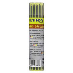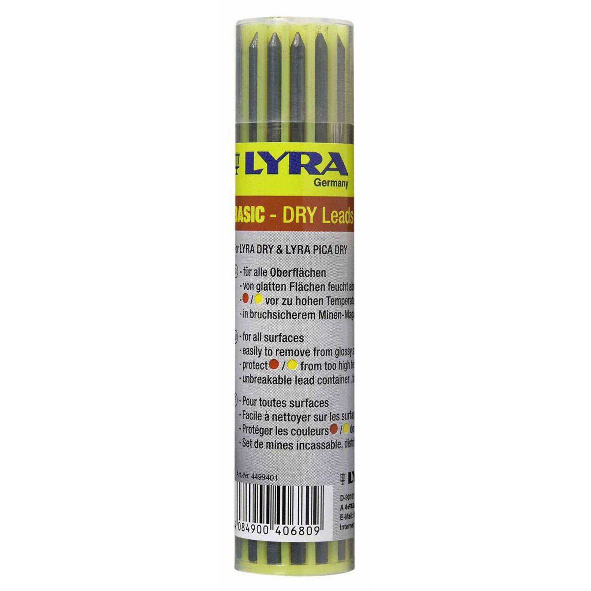 Etui de 12 mines LYRA DRY couleur (6 graphites, 3 rouges, 3 jaunes)Mines conçues pour écrire sur toutes les surfaces, livrées en distributeur les protégeant de la casse. Diamètre 2,8 mm compatible avec toute la gamme de crayons Lyra Dry.