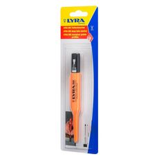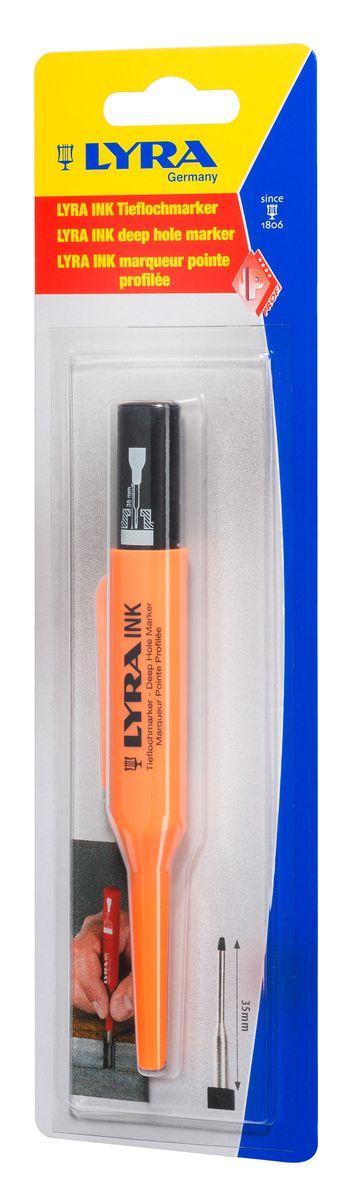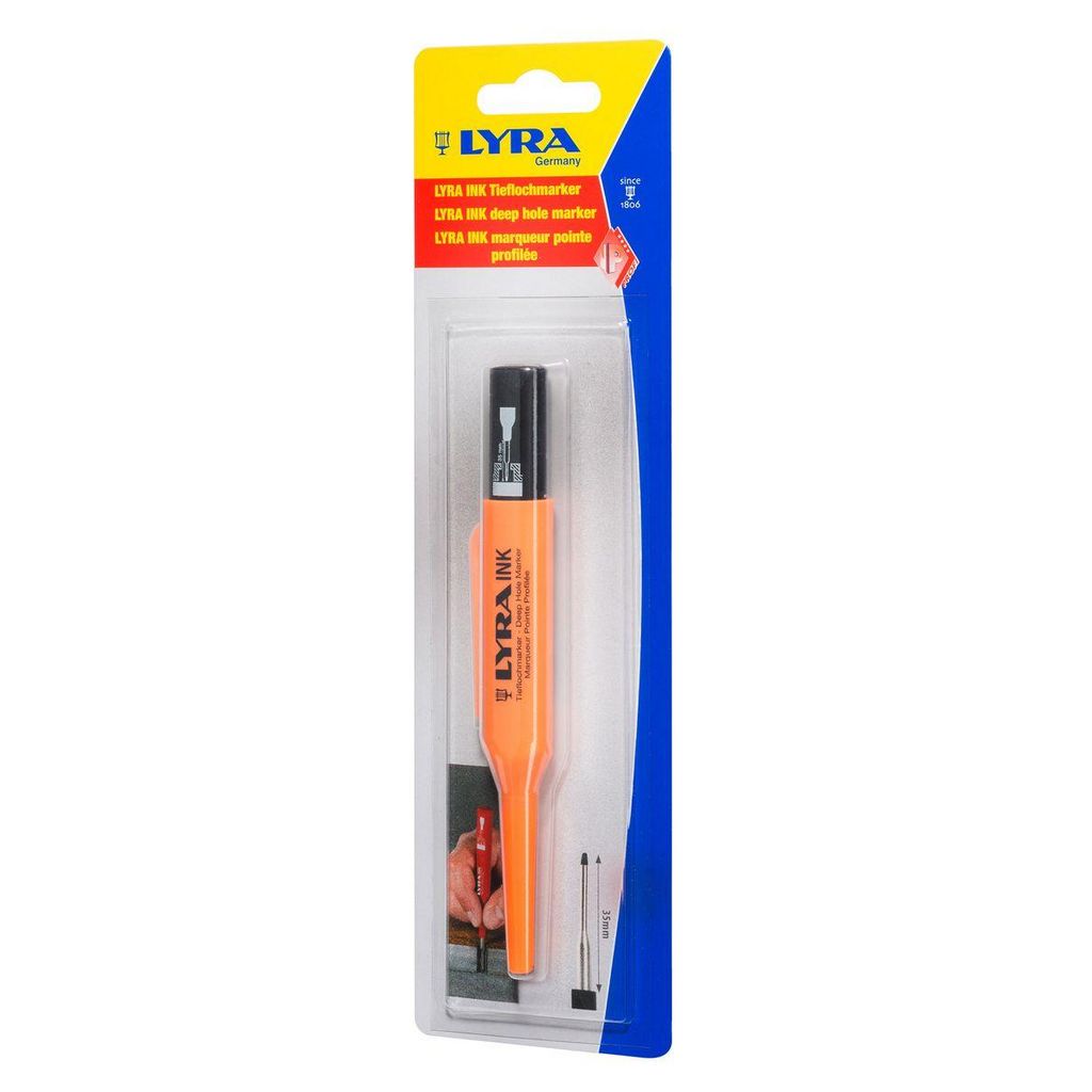 Marqueur Lyra Ink noirMarqueur Lyra à pointe fine et extra-longue Ø, 1,5 x 35 mm en acier inoxydable. Permet de marquer à travers un support (trou de vis) et de travailler dans les endroits difficiles d'accès. Forme triangulaire qui l'empêche de rouler. Encre permanente. Ecrit et marque sur to