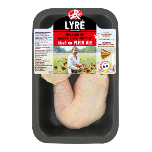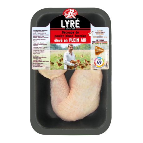"2 cuisses de poulet Fermier Lyré blanc barquette sous atmosphère protectrice 500 grs Label Rouge Filière Responsable Exclusivité Auchan" "Cuisses de Poulet Fermier Lyré blanc Label Rouge. Poulet élevé pendant 81 jours minimum par des éleveurs engagés dans une filière durable et soucieux : - du bien-être animal par un élevage en plein air, des perchoirs dans les poulaillers et la distribution de grains à la volée - de l'environnement par des actions d'envergure pour la préservation des sols et la biodiversité Tout ceci contribue à donner au poulet saveur et jutosité ! Poulet élevé sans traitement antibiotique, nourri sans OGM (<0,9%) avec des céréales françaises." Cuisse de poulet