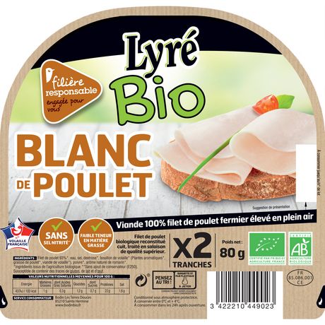 Enfin du blanc de poulet Bio sans nitrite. Ce serait bien d'en trouver avec plus de quantité.Je recommande