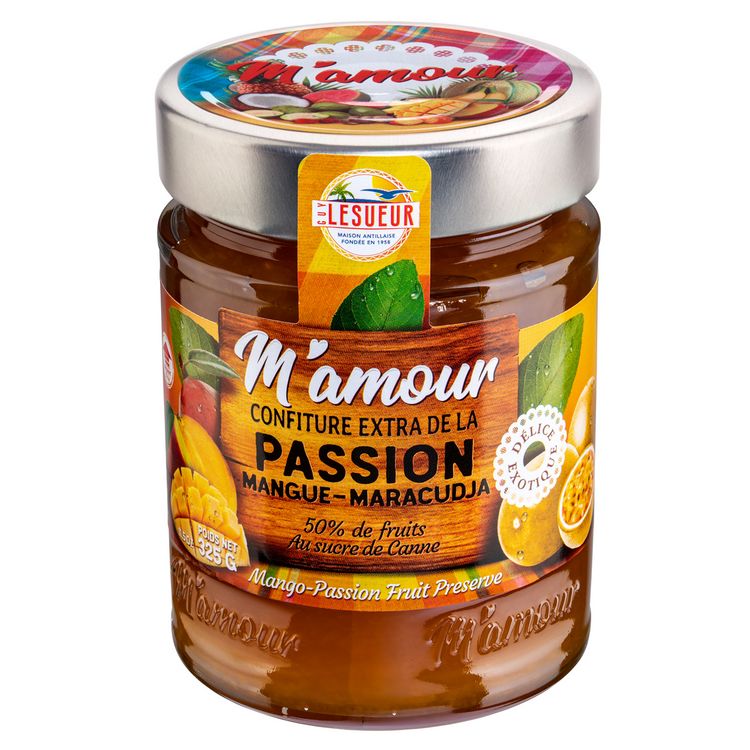 Confiture très parfumée riche en fruits. Confiture de Passion : le délicieux mélange de mangue et de maracudja, une spécialité "M'amour"
