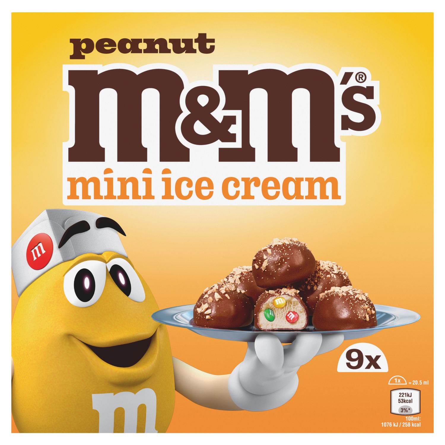 M&M's Mini Peanut (crème glacée 51% saveur cacahuète avec M&M's minis 9,1%, enrobage chocolat lait 36% et cacahuètes 2,4%) 9 bouchées 184.5ml 121,5g