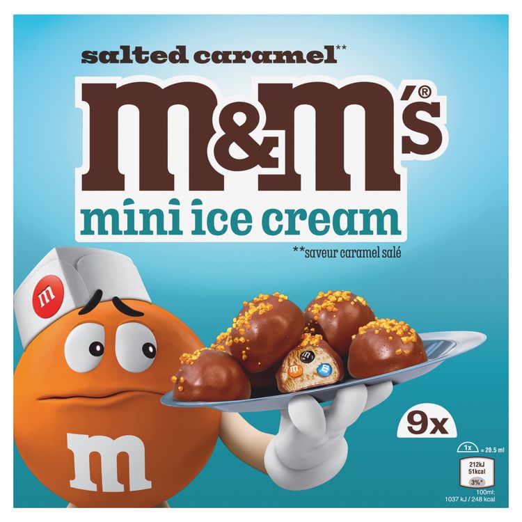 M&Ms Mini Salted caramel (crème glacée 52% saveur caramel salé, MMs minis 9,1%, enrobage choco lait 35%, éclats saveur caramel 2,7%) x9 184.5ml 121.5g