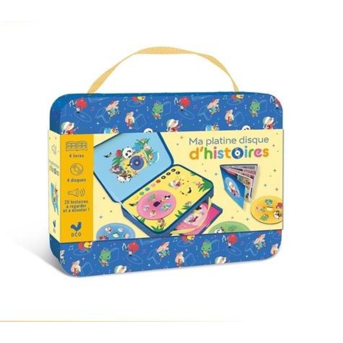 Offrez à vos enfants un coffret unique, ludique et interactif : 4 disques, 20 histoires à regarder et à écouter, 1h20 d'aventures et de rêves ! Chaque disque vous emmène dans un univers différent : L'heure des rêves Partir à l'aventure Histoires tendres Drôles d'animaux Pour chaque disque, un livret illustré dévoile de magnifiques images de chacune des histoires : l'idéal pour plonger dans l'ambiance ! Chaque livret d'histoires propose un sommaire visuel : il suffit d'appuyer sur l'un des 5 boutons sur la platine pour choisir sa piste et partir à la découverte d'un nouveau récit. Un cadeau original, sensoriel et éducatif, qui éveillera l'imagination des petits