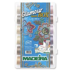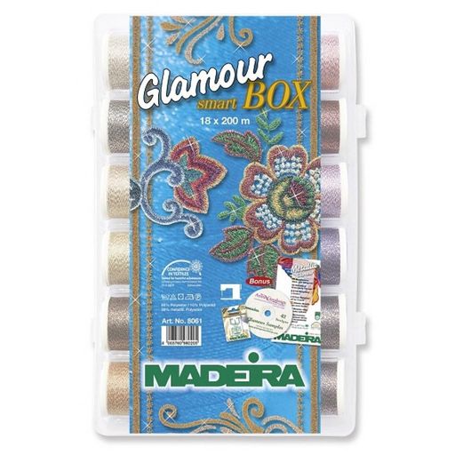 MADEIRA Smartbox GLAMOUR Fil d'effet - Réf 8061Boite de 18 bobines de fils à broder Glamour de Madeira: -Fil idéal pour la broderie. -Bobine de 200 mètres. -90% polyester métallisé - 10% polyamide. -Dimensions de la boite : 26 x 16 x 4,5 cm. Bonus gratuit : paquet de 3 aiguilles machine glamour tit