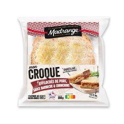 fond de légumes (arômes naturels, maltodextrine, extrait de carotte et extrait de poireau, sel, épice), sel], sauce barbecue 8,3% (eau, sucre, concentré de tomate, vinaigre de vin rouge, vinaigre d'alcool, amidon de maïs, sel, mélasse de canne, arôme naturel, poivre), béchamel 15% [LAIT demi-écrémé, farine de blé, beurre doux à 82% de matière grasse (beurre pasteurisé (LAIT)), sel, muscade, poivre], emmental râpé 15% [emmental 14% (LAIT de vache pasteurisé, sel, ferments lactiques, coagulant microbien, chlorure de calcium), fécule de pomme de terre], cornichons aigre doux 12,5% (cornichons 6,7%, eau, vinaigre d'alcool, sucre, sel, arômes naturels, affermissant : chlorure de calcium). Peut contenir fruits à coque, graines de sésame, mollusques,