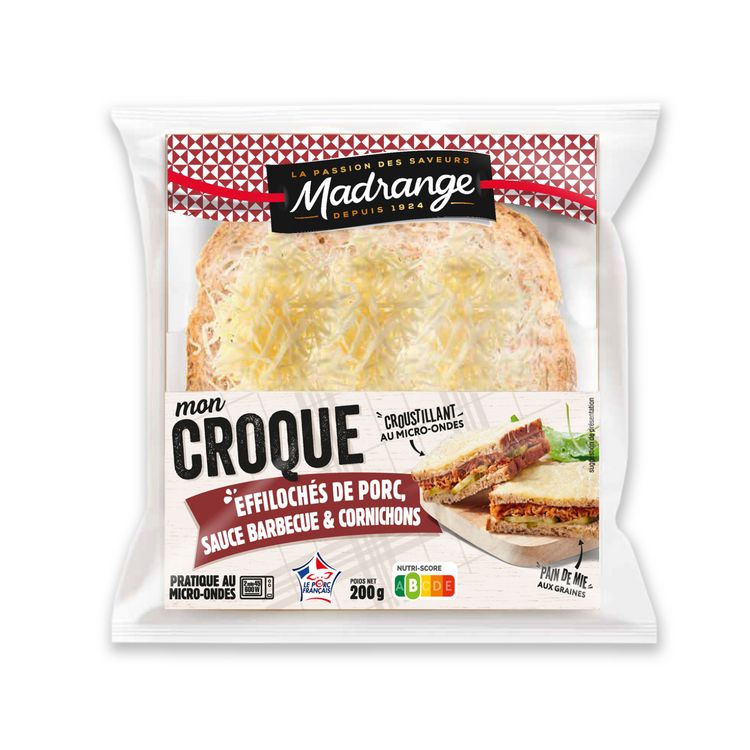 PAIN DE MIE AUX GRAINES CARNI D'EFFILOCHES DE PORC A LA SAUCE BARBECUE, DE BECHAMEL, D'EMMENTAL ET DE CORNICHONS AIGRE-DOUX