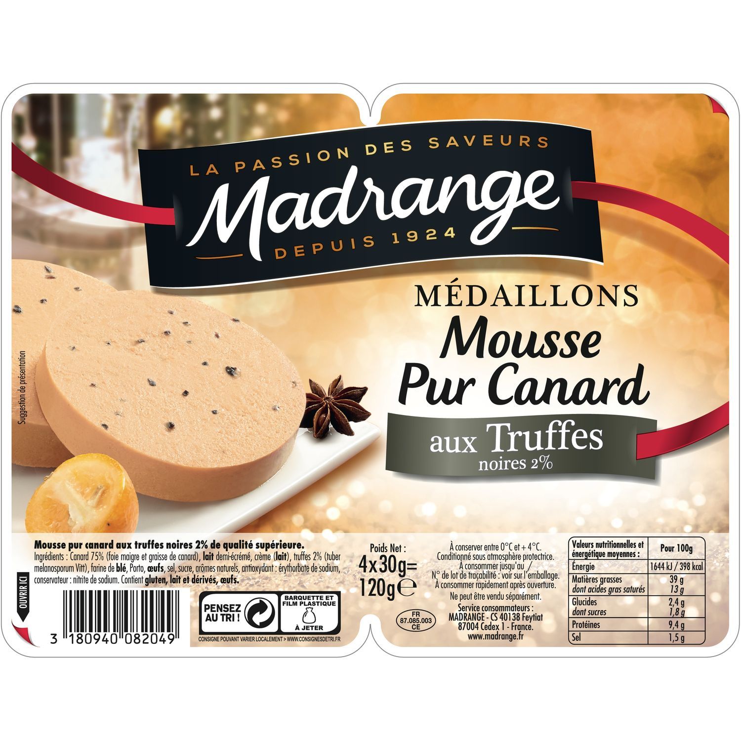 Canard 75% (graisse et mousse de foie de canard), LAIT demi-écrémé, crème (LAIT), truffes 2 % (tuber melanosporum Vitt), farine de BLE, Porto, OEUFS, sel, sucre, arômes naturels, arôme naturel truffe 0,3%, antioxydant : érythorbate de sodium, conservateur : nitrite de sodium. Canard et truffes origine UE, arôme naturel origine UE et Non-UE.