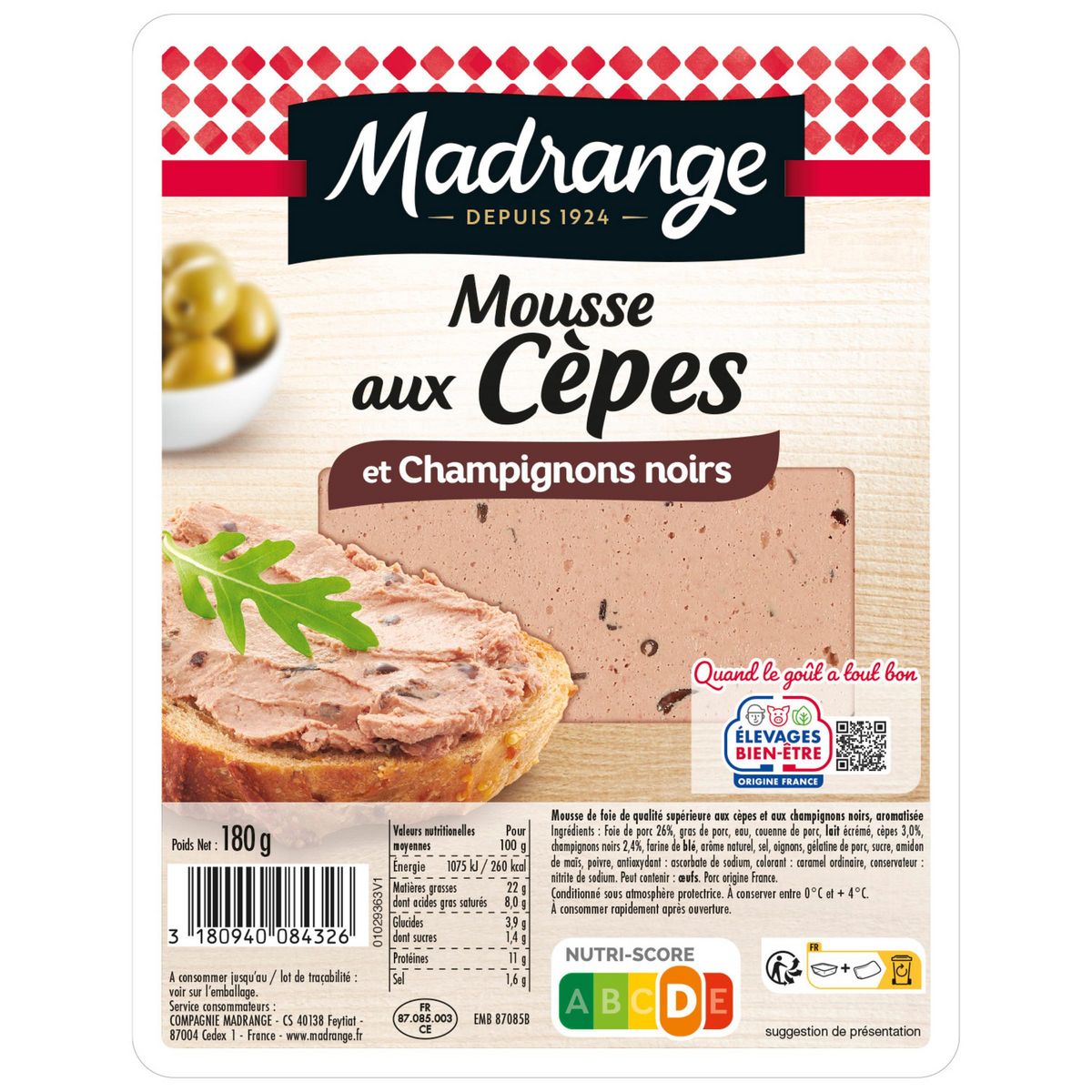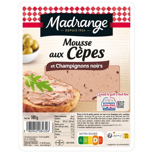 Foie de porc 26%, gras de porc, eau, couenne de porc, LAIT écrémé, cèpes 3,0%, champignons noirs 2,4%, farine de BLE, arôme naturel, sel, oignons, gélatine de porc, sucre, amidon de maïs, poivre, antioxydant : ascorbate de sodium, colorant : caramel