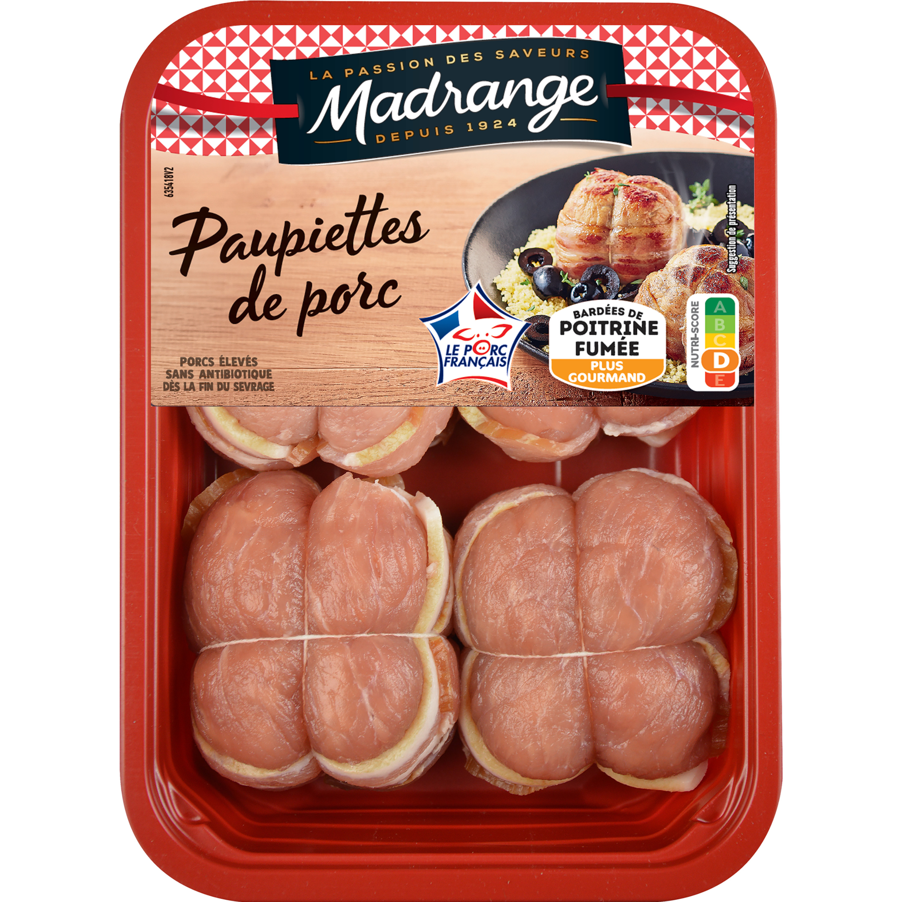 Les paupiettes de porc Madrange sont entourées de fines tranches de lard fumé avec une chair cuisinée aux oignons.