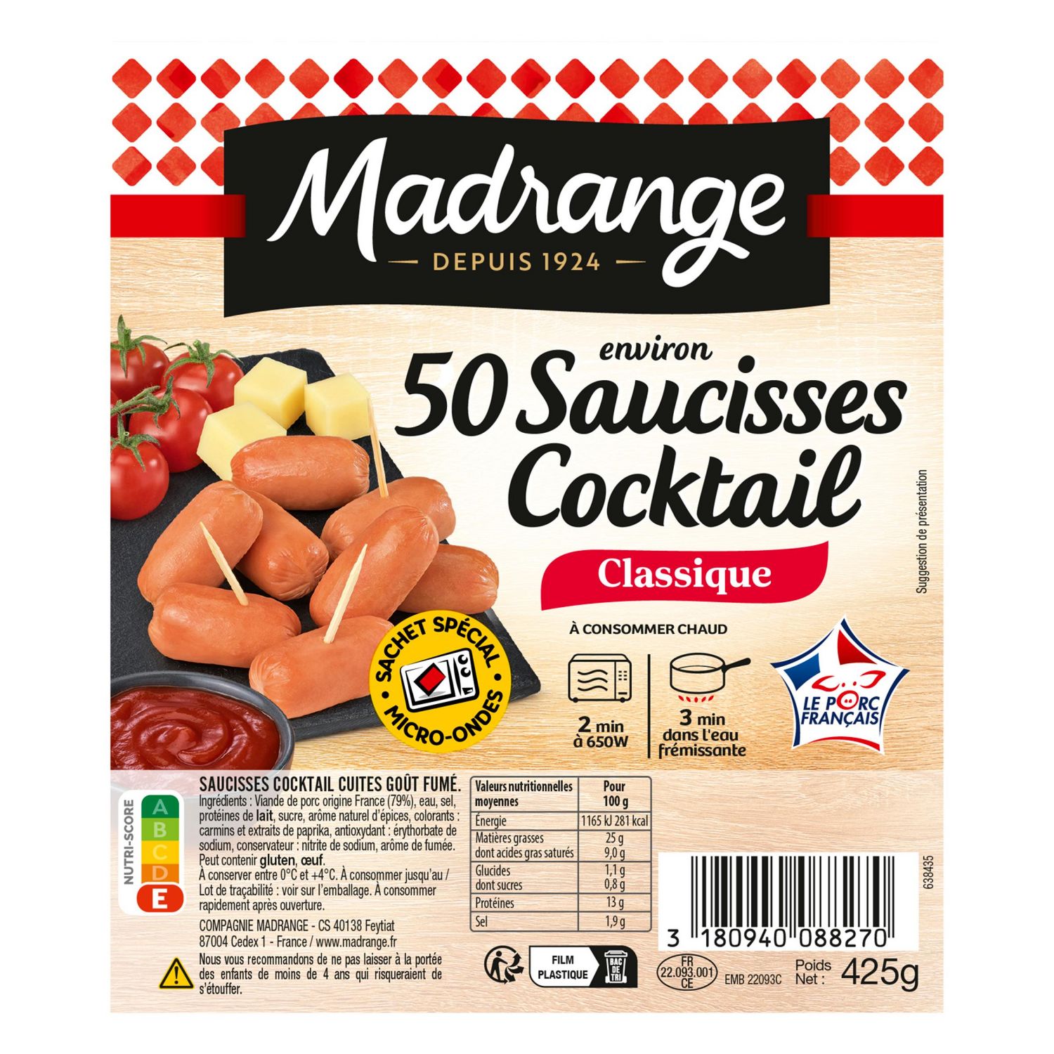 Viande de porc (79%), eau, sel, protéines de LAIT, sucre, arôme naturel d’épices, colorants : carmin et extraits de paprika,