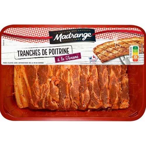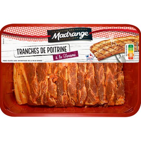 Des tranches de poitrine découpées généreusement, délicatement marinées dans une préparation alliant note d'oignon et goût fumé. 10 tranches de poitrine de porc sans os saumurées marinées à la texane