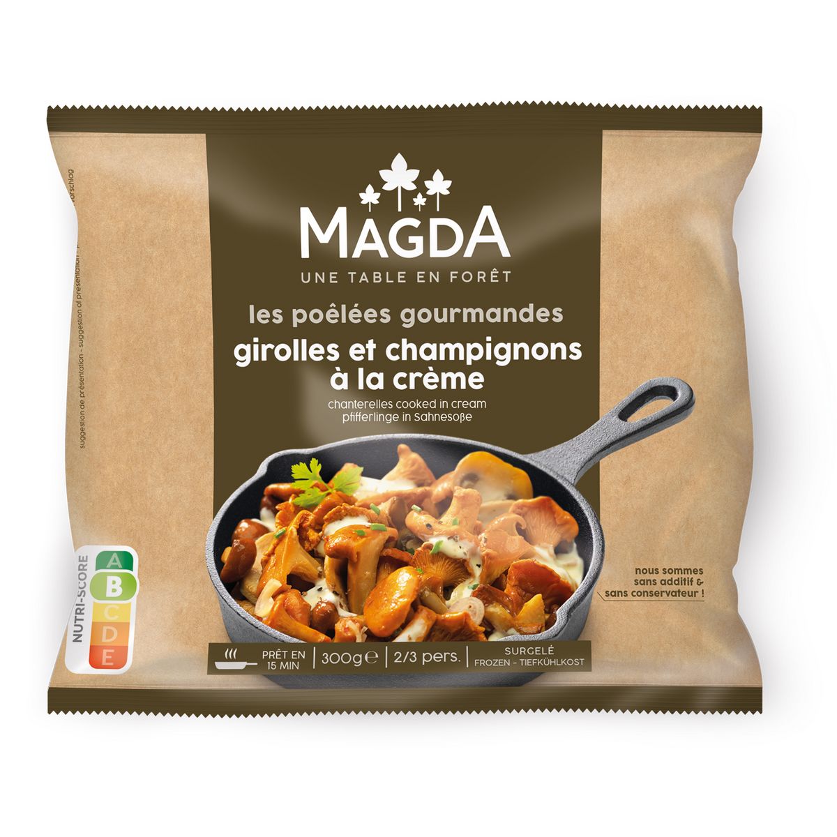 Ingrédients : Girolles morceaux (28%), pholiotes entières (24%), Eau (18%), échalotte (9%), champignons paris (8%), crème en poudre (5%), beurre (LAIT) (Crème fraiche pasteurisée, ferments lactiques), ail mini tablette (2%), ciboulette (1%), persil (1%), Sel (0,3%), lait (amidon, maltodextrine) ( 0,3%), Poivre (0,01%)