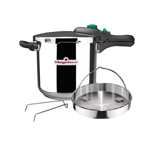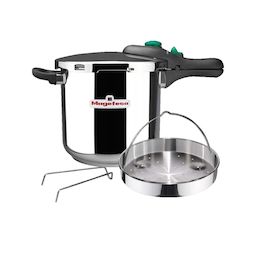 Découvrez l'autocuiseur Magefesa Dynamic de 6 litres, idéal pour une cuisson rapide et efficace. Ce modèle permet de cuire jusqu'à 5 fois plus vite qu'un autocuiseur standard, tout en conservant les vitamines et les saveurs des aliments. Fabriqué en acier inoxydable 18/10, il est robuste et élégant