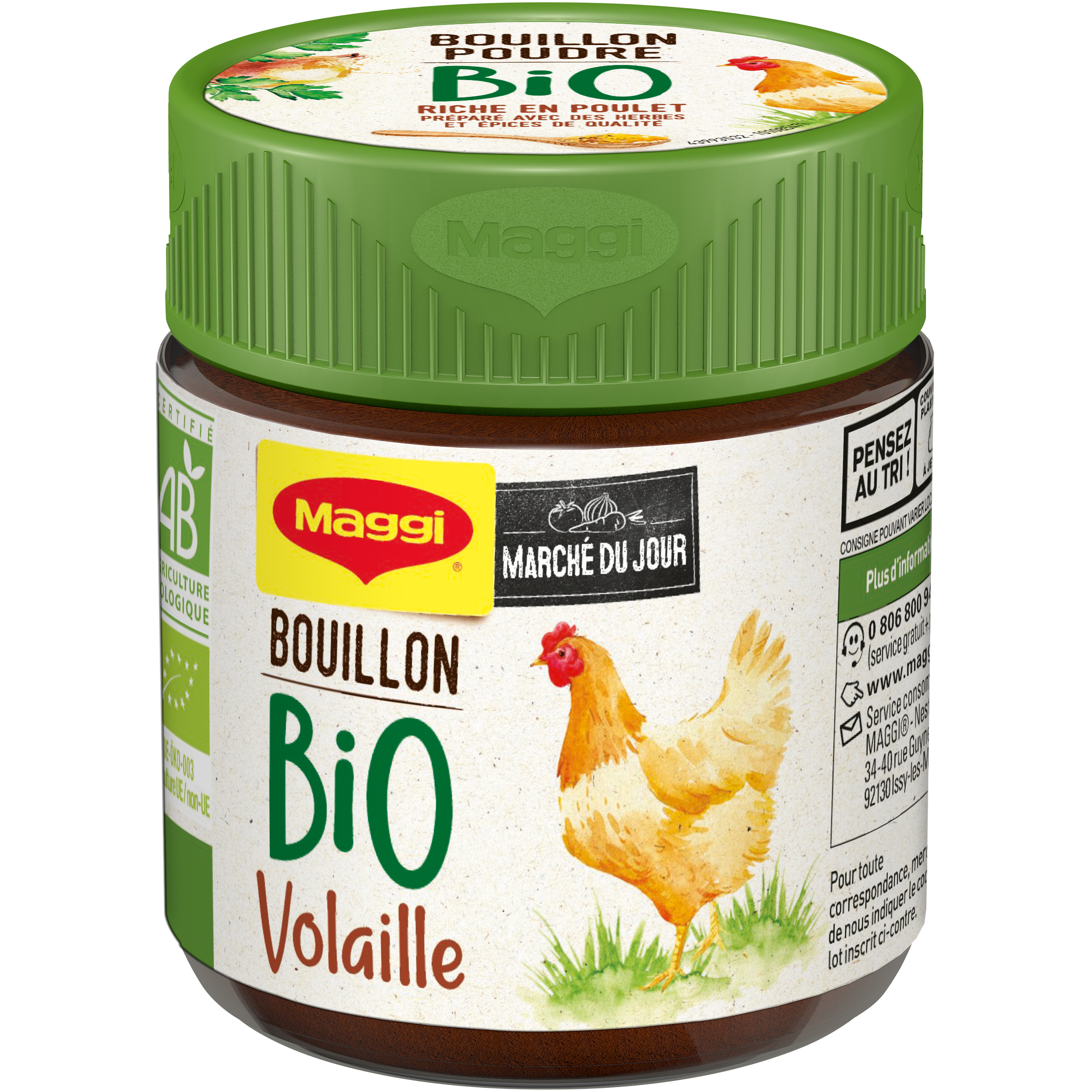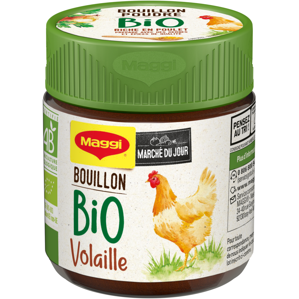 Découvrez le nouveau bouillon en poudre volaille BIO de MAGGI ! Ce bouillon sur-mesure, au format original, vous permet de doser le bouillon selon vos envies et vos goûts, pour réhausser vos recettes du quotidien. Fabriqué à partir d'ingrédients agricoles de qualité issus de l'agriculture biologique, il est riche en poulet et préparé avec des herbes et épices de qualité. Il peut s'utiliser à toutes les étapes de vos préparations: directement dans vos poêlées, dans l'eau de cuisson des pâtes ou du riz, dans vos mijotés ou dans vos soupes. Sans huile de palme, car la texture poudre de ce bouillon ne nécessite pas son ajout. Pot en verre recyclable. Bouillon en poudre à la volaille, aromatisé