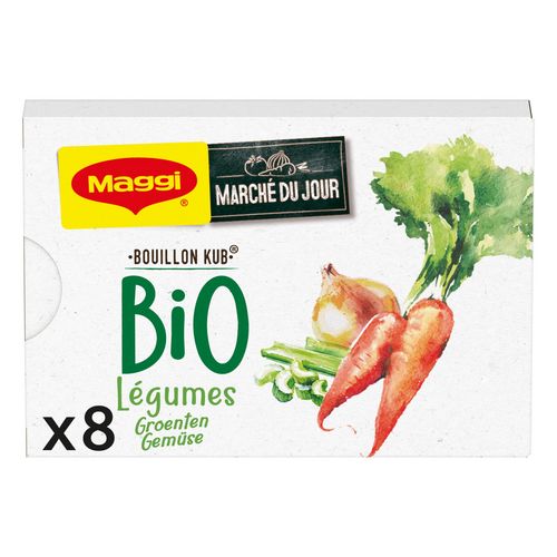 Tout le savoir-faire de MAGGI aussi en BIO ! Retrouvez le bon goût des légumes dans votre petit cube en version BIO ! Avec son goût intense et cuisiné et ses ingrédients sélectionnés et de qualité, votre cube MAGGI BIO aux légumes sera l'allié de toutes vos préparations quotidiennes : pâtes, riz, soupes, mijotés et autres poêlées de légumes. Le petit plus ? Ce cube bouillon est préparé avec du beurre de karité bio. Astuce : pour apporter une note fine et gourmande à vos poissons, émiettez les cubes directement sur leur dos avant cuisson. Les enveloppes de vos MAGGI Bouillon KUB BIO Légumes sont en papier et recyclables !
