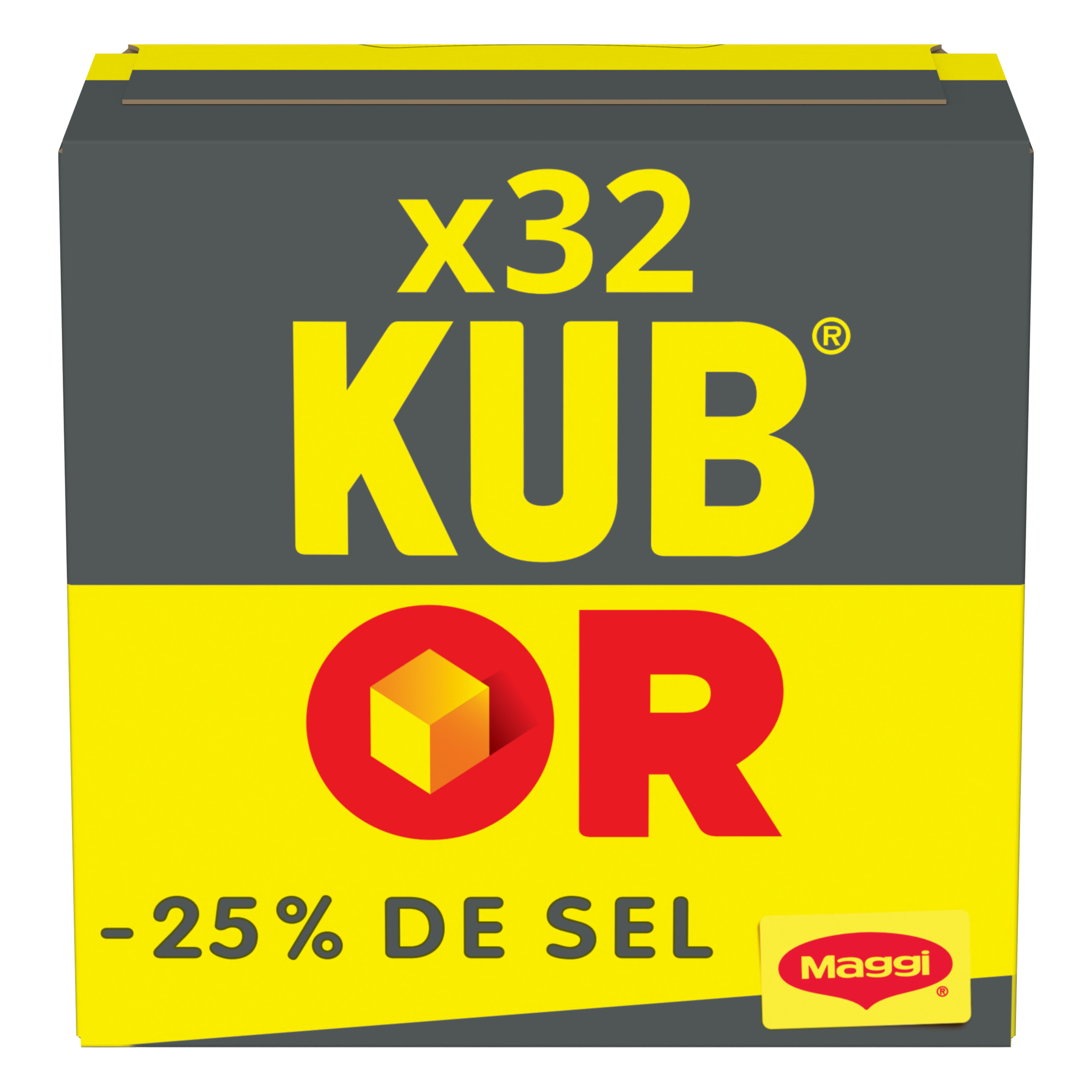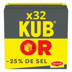 Découvrez le bouillon KUB OR réduit en sel, le goût inimitable de KUB OR de MAGGI avec 25% de sel en moins*. Il vous permettra de rehausser le goût de vos plats en limitant votre apport en sel ! Les recettes MAGGI sont développées avec soin par les chefs cuisiniers MAGGI. En s'inspirant du fait maison, ces cubes de bouillons sont élaborés à partir de viandes et/ou de légumes (selon les recettes), d'épices, d'herbes et de sel. La forme déshydratée de ces ingrédients permet une bonne conservation dans le temps des bouillons. Une fois mélangés, les ingrédients sont compressés dans un moule qui leur donne leur forme de cube : vous n'avez plus qu'à les diluer ou les émietter dans vos préparations pour obtenir des plats encore plus savoureux ! * Par rapport à la moyenne du marché des bouillons hors réduits en sel.