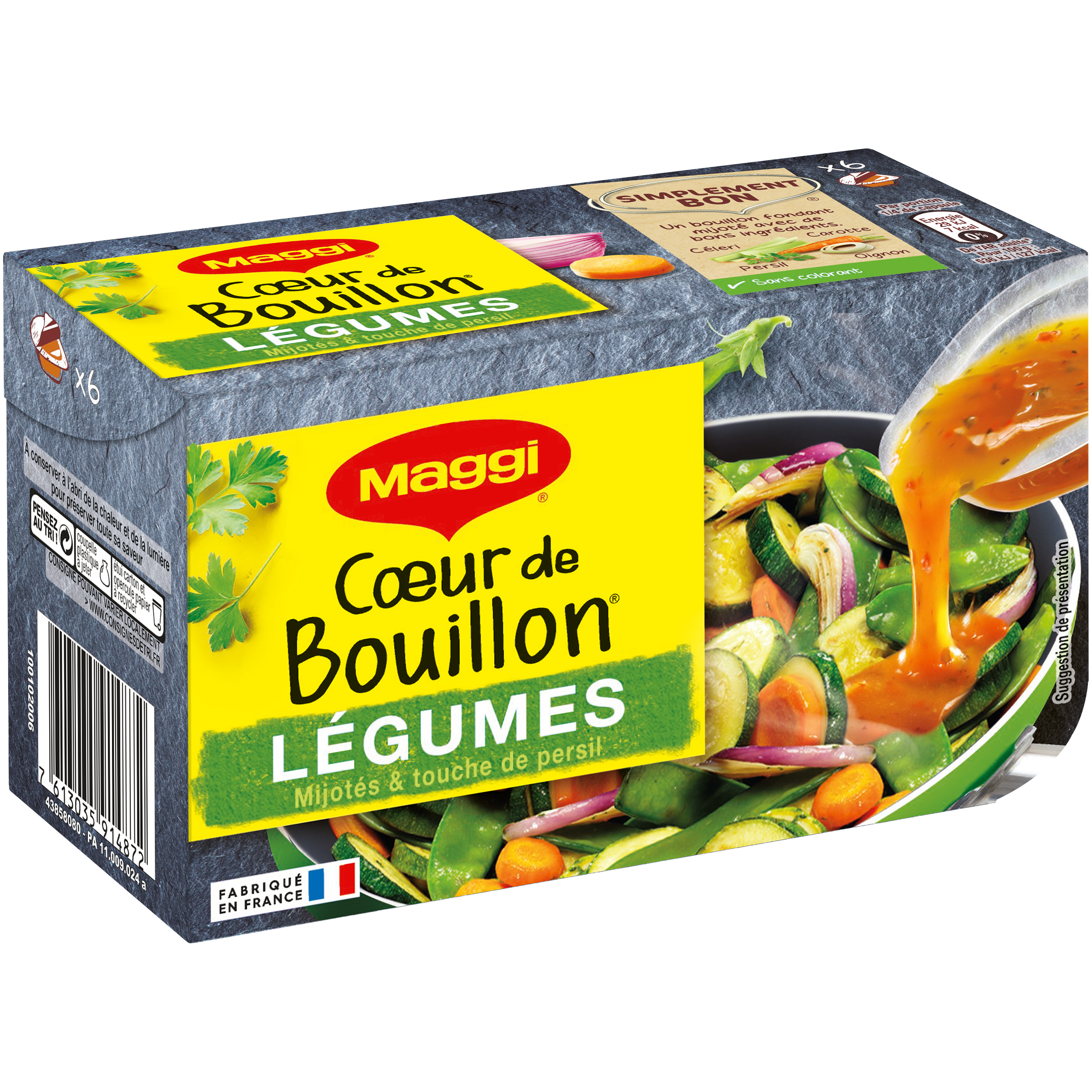 Relevez la saveur de vos plats avec COEUR DE BOUILLON Légumes mijotés et touche de persil. Un bouillon liquide ultra fondant mijoté avec de bons ingrédients soigneusement sélectionnés pour leurs goûts : des légumes (carottes, oignons, poireaux) associés à de délicieux jus de légumes obtenus à partir de légumes frais (carottes, oignons, céleri, panais, fenouil, chou-fleur) et une pointe de persil. Idéal pour rehausser le goût de vos poêlées de courgettes, de vos légumineuses ou simplement pour assaisonner vos soupes maisons. Astuce : parfumez votre riz blanc en un seul geste en ajoutant une capsule COEUR DE BOUILLON Légumes mijotés et touche de persil directement sur votre riz égoutté encore chaud (250g pesés avant cuisson) en mélangeant bien jusqu'à ce que le bouillon ait totalement fondu ! Dosage: 1 coupelle pour un plat de 4 personnes. Bouillon concentré aux légumes en capsule, aromatisé