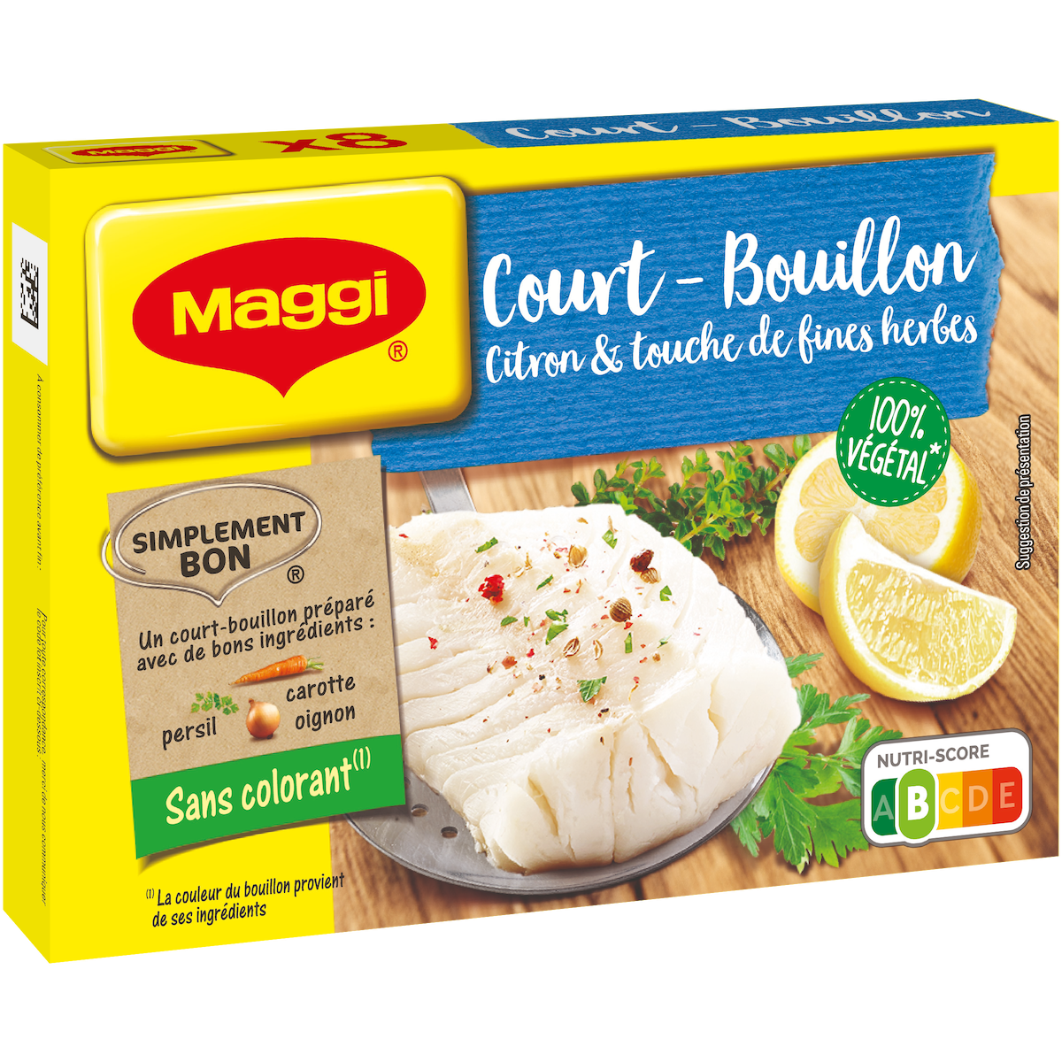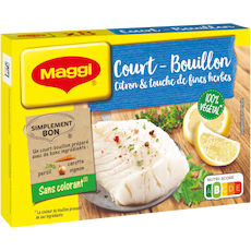Donnez une note délicate et parfumée à vos poissons et crustacés avec le Court-bouillon Citron et touche de fines herbes de MAGGI. Rien de tel pour donner de la fraîcheur et sublimer vos plats . Découvrez dès maintenant ce petit cube de bouillon 100% végétal* au goût subtil de citron et fines herbes ! * Ne contient pas d'ingrédient d'origine animale.