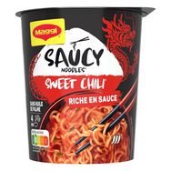 Découvrez la nouvelle gamme de nouilles instantanées SAUCY NOODLES® de MAGGI® et voyagez au travers des saveurs phares de l'Asie ! Laissez-vous tenter par la saveur sweet chili*. Cette recette épicée, à base de piments et de paprika, est inspirée de la tradition culinaire chinoise. Un plat préparé de nouilles instantanées et riche en sauce, prêt en 4 minutes et dans un format cup** pratique à emporter. SANS HUILE DE PALME .*Chili doux.** pot