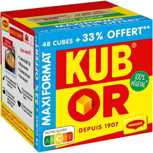 KUB OR , un petit cube qui a du génie ! Ce produit iconique vous accompagne au quotidien avec son goût intense et inimitable pour une cuisine toujours plus savoureuse. Une recette 100% végétale* qui relève agréablement vos plats depuis 1907. * Ne contient pas d'ingrédient d'origine animale. Les recettes MAGGI sont développées avec soin par les chefs cuisiniers MAGGI. En s'inspirant du fait maison, ces bouillons sont élaborés à partir de viandes et/ou de légumes (selon les recettes), d'épices, d'herbes et de sel. La forme déshydratée de ces ingrédients permet une bonne conservation dans le temps des bouillons. Une fois mélangés, les ingrédients sont compressés dans un moule qui leur donne leur forme de cube : vous n'avez plus qu'à les diluer ou les émietter dans vos préparations pour obtenir des plats encore plus savoureux !