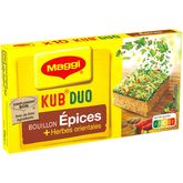 Bouillon déshydraté aux épices et herbes, aromatisées Découvrez le bouillon double couche KUB DUO Epices et Herbes orientales ! LE petit geste qui change tout, grâce à l'alliance parfaite d'un bouillon de légumes, d'épices (coriandre, curcuma, cumin et une pointe de piments) et d'herbes aromatiques. Ce bouillon donnera une note subtile d'épices à tous vos plats et les embellira grâce à ses nombreux marquants. Le petit plus : il est 100% végétal* ! Astuce : parfait pour relever le goût de vos recettes de tajines, couscous, ou ratatouilles ! * Ne contient pas d'ingrédient d'origine animale.