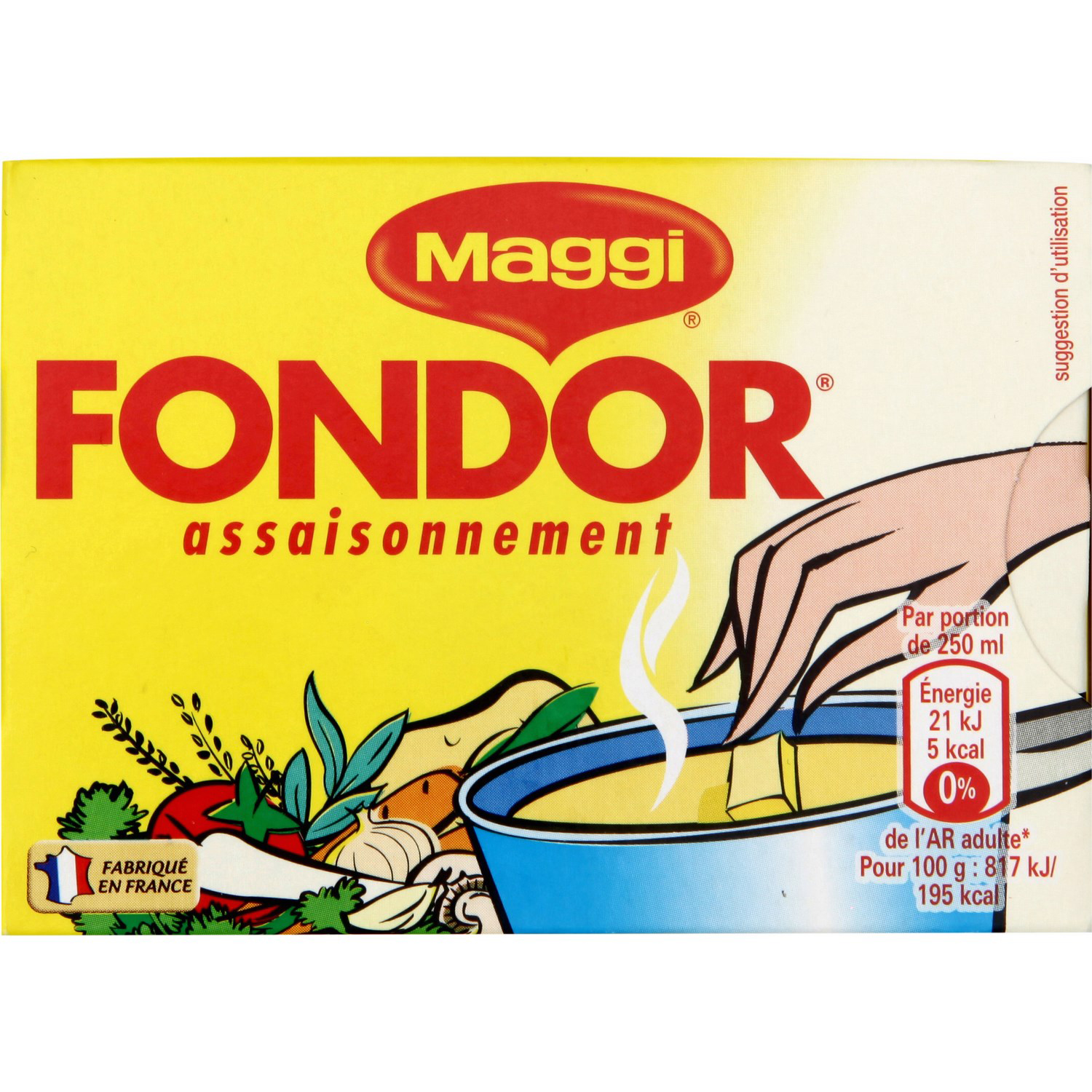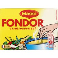 Rehaussez le goût de tous vos plats avec FONDOR de MAGGI . Un bouillon 100% végétal, idéal pour assaisonner vos potages, consommés, pâtes, riz, ainsi que vos viandes. *Ne contient pas d'ingrédient d'origine animale Les recettes MAGGI sont développées avec soin par les chefs cuisiniers MAGGI. En s’inspirant du fait maison, ces bouillons sont élaborés à partir de viandes et/ou de légumes (selon les recettes), d’épices, d’herbes et de sel. La forme déshydratée de ces ingrédients permet une bonne conservation dans le temps des bouillons. Une fois mélangés, les ingrédients sont compressés dans un moule qui leur donne leur forme de cube : vous n’avez plus qu’à les diluer ou les émietter dans vos préparations pour obtenir des plats encore plus savoureux ! Bouillons fabriqués en France.