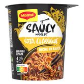 Découvrez la nouvelle gamme de nouilles instantanées SAUCY NOODLES® de MAGGI® et voyagez au travers des saveurs phares de l'Asie ! Laissez-vous tenter par la saveur soja classique. Cette recette, aux notes de sauce soja, poivrons rouges, et gingembre, le tout enrobé dans une sauce généreuse, est inspirée de la tradition culinaire asiatique. Un plat préparé de nouilles instantanées et riche en sauce, prêt en 4 minutes et dans un format cup* pratique à emporter. SANS HUILE DE PALME.* pot .