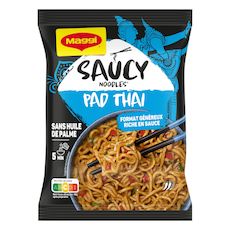 Découvrez la nouvelle gamme de nouilles instantanées SAUCY NOODLES® de MAGGI® et voyagez au travers des saveurs phares de l'Asie ! Laissez-vous tenter/porter par la générosité de nos nouilles pad thaï, sa sauce et ses petits légumes. Cette recette, à base de petits légumes et pousses de bambou, est inspirée de la tradition culinaire thaïlandaise, de ses marchés flottants et ses célèbres festivals de street food. Un plat préparé de nouilles instantanées et riche en sauce, prêt en 5 minutes et dans un format généreux.