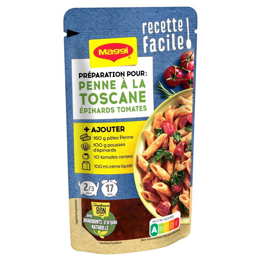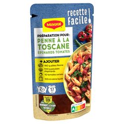 Il vous faut : 160 g pâtes Penne, 100 g gousses d'épinards, 10 tomates cerises (150 g), 100 ml crème liquide. 3 étapes faciles en 17 min : Coupez les tomates en deux. Dans une poêle ou un wok, faites cuire les pousses d'épinards avec un peu d'huile (5 g) 2 min. Ajoutez les pâtes crues, 300 ml d'eau, les tomates, la crème et la préparation Maggi. Mélangez et cuire à couvert env 14 min à ébullition en mélangeant jusqu'à absorption de la sauce. Mélangez et servez ! Ne pas saler.