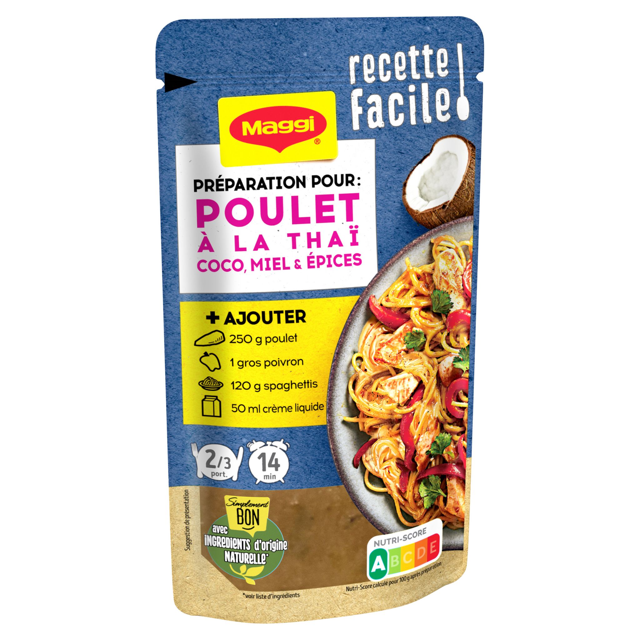 Il vous faut : 250 g poulet, 1 gros poivron (350 g), 120 g spaghettis, 50 ml crème liquide. 3 étapes faciles en 14 min : Faites cuire les pâtes. Pendant ce temps, coupez le poivron et le poulet en lamelles. Dans une poêle, faites dorer le poulet env 2 min avec un peu d'huile (5 g). Ajoutez le poivron ; cuire env 5 min. Ajoutez les pâtes égouttées, la préparation Maggi, la crème et 50 ml d'eau dans la poêle ; cuire 1 min. Mélangez et servez ! Ne pas saler.