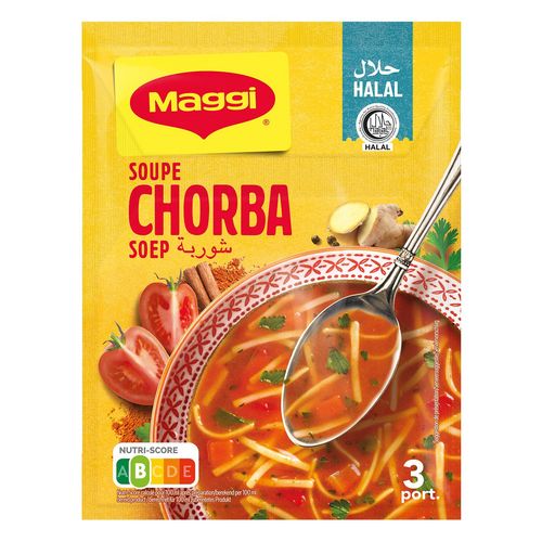 Découvrez cette délicieuse soupe Chorba Halal de MAGGI® regorgeant de saveurs, où le bon goût des tomates se marie parfaitement avec un subtil mélange d'épices et de herbes/herbes aromatiques : cumin, curcuma, graine de coriandre, persil... Un véritable délice à chaque cuillère ! Avec MAGGI®, profitez d'une soupe savoureuse et réconfortante qui vous emmène pour un voyage culinaire au cœur du Maghreb. Prête en seulement 5 minutes. Régalez-vous !