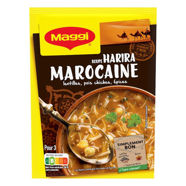 Avec son subtil mélange d'épices et de plantes aromatiques, cette délicieuse soupe Harira MAGGI m'emmène au cœur des ruelles des médinas marocaines et son marché aux épices: coriandre, curcuma, paprika, piment… quel délice! Avec MAGGI, retrouvez tout le plaisir d'une bonne soupe exotique prête en 7 minutes. Régalez vous !