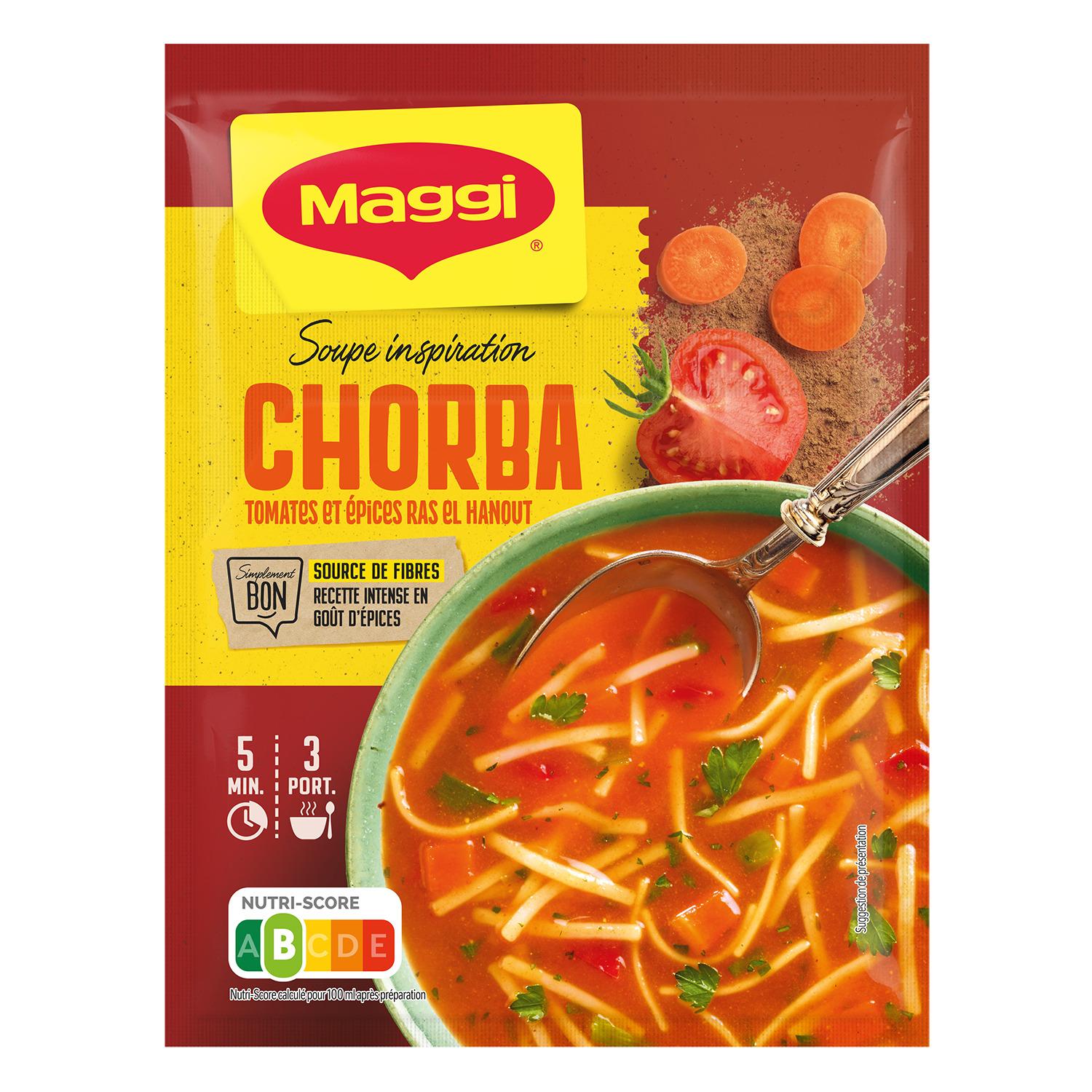 Avec son subtil mélange d'épices et ses tomates, cette délicieuse soupe inspiration Chorba MAGGI® vous emmène au cœur du Maghreb et son marché aux épices: cumin, curcuma, coriandre… quel délice ! Avec MAGGI ®, retrouvez tout le plaisir d'une bonne soupe exotique prête en 5 minutes. Régalez vous !
