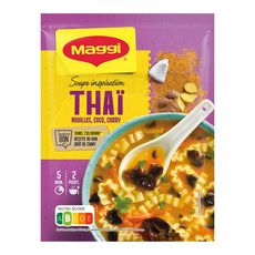 Le parfum de cette délicieuse soupe inspiration Thaï MAGGI®, légèrement épicée avec sa note curry et délicatement parfumée au lait de coco, ses nouilles et ses champignons noirs vous emportent pour un voyage gourmand au cœur de la Thaïlande. Avec MAGGI®, retrouvez tout le plaisir d'une bonne soupe exotique prête en 5 minutes et régalez vous !
