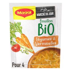 MAGGI vous propose une recette exclusive, un bon bouillon de légumes avec de généreux vermicelles fondants. MAGGI a soigneusement sélectionné pour vous de bons légumes issus de l'agriculture biologique, le tout est délicatement relevé par une pointe de persil. Facile à préparer et cuite en seulement 5 minutes, les 4 portions raviront toute la famille.
