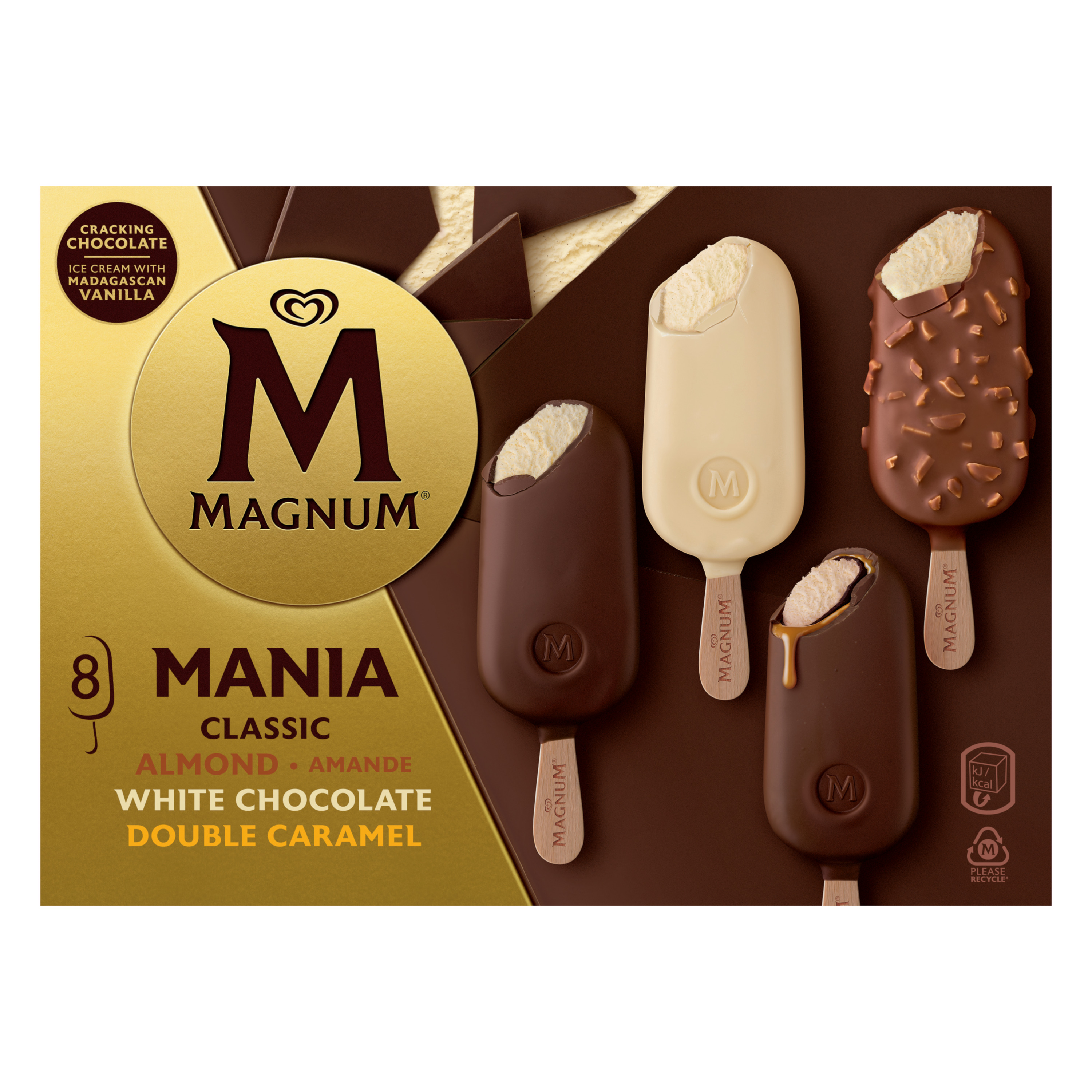 Succombez à toutes vos envies avec la boîte de bâtonnets Magnum Mania. Les 4 glaces incontournables de la marque sont réunies pour satisfaire tous les goûts. Magnum Amande, Magnum Classic, Magnum Chocolat Blanc et Magnum Double Caramel : réveillez vos papilles avec cet assortiment de glaces savoureuses. Croquez dans la couche de chocolat au lait aux éclats d’amandes du Magnum Amande qui dévoile une glace vanille onctueuse. Redécouvrez la délicieuse glace vanille enrobée d’une couche de chocolat au lait craquant du Magnum Classique. Fondez de plaisir avec le Magnum Chocolat Blanc et sa couche de chocolat blanc croquante. Osez Magnum Double Caramel, une onctueuse glace vanille enrobée d’une double couche de chocolat au lait et d’une sauce caramel intense. Sortez les glaces Magnum du congélateur quelques minutes avant de les déguster afin de profiter pleinement de leurs saveurs. Magnum voit le jour en 1989 afin de satisfaire un désir de gourmandise activement recherché par les adultes. Le bâtonnet, un format jusque-là plutôt réservé aux enfants, se pare alors d’un enrobage au chocolat de grande qualité. Magnum devient ainsi la première marque de glaces entièrement consacrée aux plaisirs gourmands des adultes. Depuis, Magnum ne cesse de surprendre en élargissant chaque année son offre de nouveaux parfums. Aujourd’hui leader sur le marché de la glace, la marque offre une expérience toujours plus intense et premium. Les créations Magnum ? Irrésistibles de l’extérieur, onctueuses à l’intérieur, aussi savoureuses qu’intemporelles, elles ont su traverser les modes et s’imposer comme des saveurs incontournables. Leur signature ? Une forme emblématique, des parfums synonymes de plaisir à l’état pur et ce fameux chocolat craquant incomparable, qui n’a jamais failli à ses délicieuses promesses ! Magnum s’engage en certifiant la qualité et l’origine de ses ingrédients. 100 % du cacao du chocolat Magnum est cultivé de façon durable dans des plantations labélisées Rainforest Alliance, une ONG internationale qui agit sur 3 piliers : écologique, social et économique. À redécouvrir et à savourer, encore et toujours. Magnum, fidèle au plaisir.