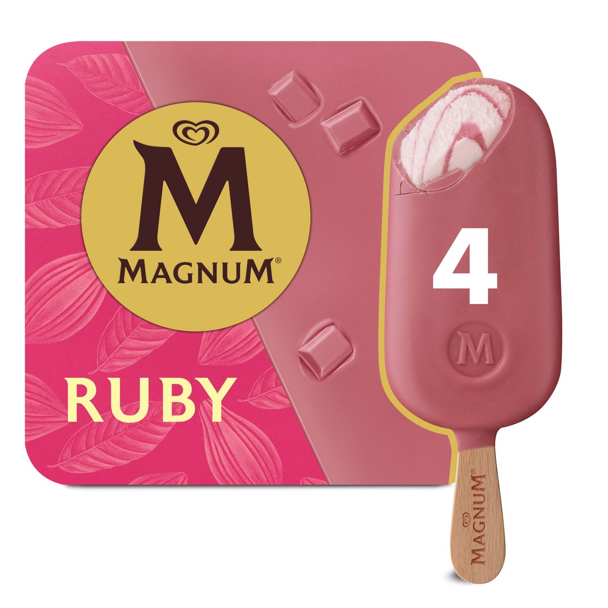 Glace au chocolat blanc (dont 4% de chocolat blanc) avec une sauce framboise (8%) enrobée de chocolat de couverture (29%). À quand remonte la dernière fois que vous avez vécu une expérience extraordinaire pour la première fois ? 80 ans après la découverte du chocolat blanc, préparez-vous à goûter un quatrième type de chocolat pour la première fois dans une glace Magnum. Après le noir, le lait et le blanc, le chocolat Ruby est la découverte chocolat la plus extraordinaire des 80 dernières années dans l’industrie du chocolat. Il a fallu 10 années de recherche pour arriver à créer un chocolat de qualité à partir de ces fèves de cacao appelées « Ruby ». Le processus unique de transformation utilisé libère l'arôme naturellement présent et le ton de couleur de la fève. Sa couleur est d’un Ruby étincelant et son goût est constellé de notes acidulées et fraîches de baies, sans aucune amertume. Les fèves de cacao dont est issu le chocolat Ruby proviennent uniquement d’Équateur, du Brésil et de Côte d’Ivoire. Ces régions disposent de conditions d’humidité, de températures et d’ensoleillement propices au développement des fèves Ruby. Le procédé de fabrication du chocolat Ruby est très délicat car tout doit aller très vite pour préserver cette belle couleur. En effet, ce sont les antioxydants naturellement rouges contenus dans les fèves de cacao Ruby que l’on doit préserver tout au long du procédé de fabrication pour obtenir au final un chocolat Ruby d’un rose vibrant et envoûtant. Croquez dans la coque en chocolat du nouveau Magnum Ruby, sentez d'abord le crémeux et la douceur du chocolat, pour ensuite découvrir un surprenant goût de baies fruités. Et cela sans aucun colorant ou arôme de fruit ajoutés. À l’intérieur de cette délicieuse coque Ruby, la glace au chocolat blanc accompagne les notes acidulées du chocolat Ruby du début à la fin de la dégustation. Enfin, un tourbillon de sauce à la framboise complète parfaitement cette création unique pour compléter la note fruitée et fraîche de votre bâtonnet glace. agnum, fidèle au plaisir.