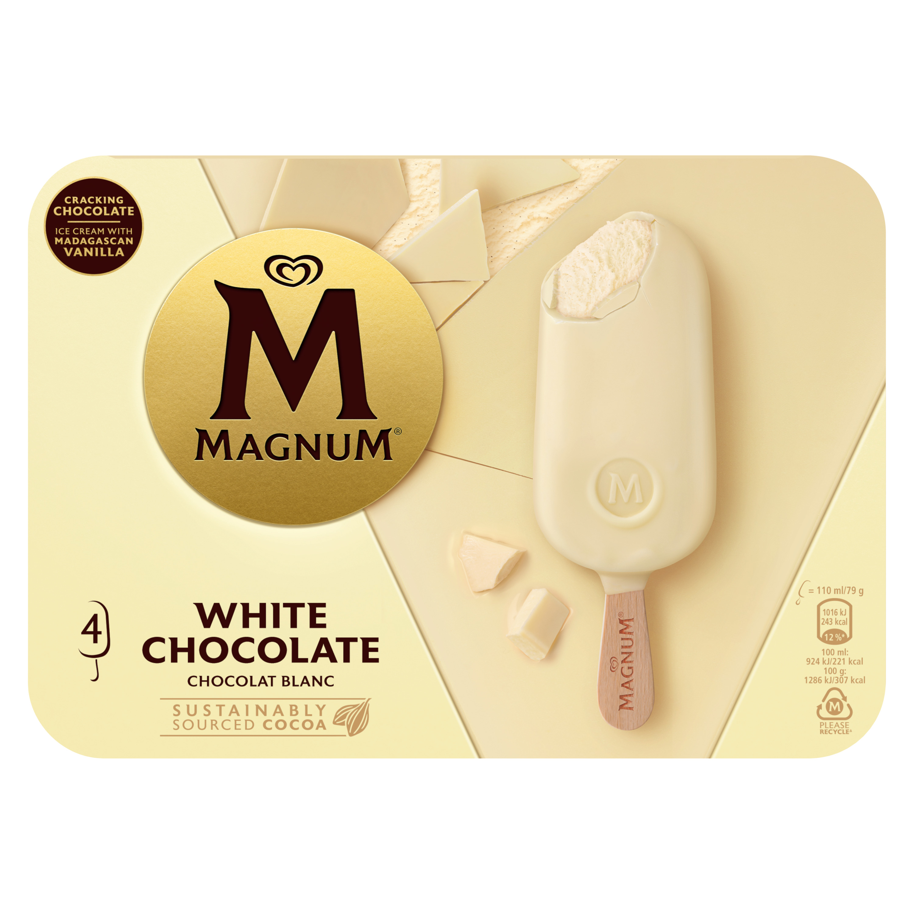 Magnum Chocolat Blanc est une onctueuse glace vanille enrobée d'un chocolat blanc craquant qui saura ravir vos papilles. Retrouvez le croquant Magnum dès la première bouchée, un enrobage chocolat blanc à la saveur inégalée qui dévoile une glace onctueuse. Parfum historique et emblématique de Magnum, ce bâtonnet gourmand Magnum Chocolat Blanc est un incontournable dans l'univers de la glace depuis plus de 25 ans. Une expérience de plaisir intense pour les adeptes du chocolat blanc. Pour profiter pleinement de leurs saveurs, sortez vos glaces Magnum du congélateur quelques minutes avant de les déguster. Magnum voit le jour en 1989 afin de satisfaire un désir de gourmandise activement recherché par les adultes. Le bâtonnet, un format jusque-là plutôt réservé aux enfants, se pare alors d'un enrobage au chocolat de grande qualité. Magnum devient ainsi la première marque de glaces entièrement consacrée aux plaisirs gourmands des adultes. Depuis, Magnum ne cesse de surprendre en élargissant chaque année son offre de nouveaux parfums. Aujourd'hui leader sur le marché de la glace, la marque offre une expérience toujours plus intense et premium. Les créations Magnum ? Irrésistibles de l'extérieur, onctueuses à l'intérieur, aussi savoureuses qu'intemporelles, elles ont su traverser les modes et s'imposer comme des saveurs incontournables. Leur signature ? Une forme emblématique, des parfums synonymes de plaisir à l'état pur et ce fameux chocolat craquant incomparable, qui n'a jamais failli à ses délicieuses promesses ! Magnum s'engage en certifiant la qualité et l'origine de ses ingrédients. 100 % du cacao du chocolat Magnum est cultivé de façon durable dans des plantations labélisées Rainforest Alliance, une ONG internationale qui agit sur 3 piliers : écologique, social et économique. À redécouvrir et à savourer, encore et toujours. Magnum, fidèle au plaisir.