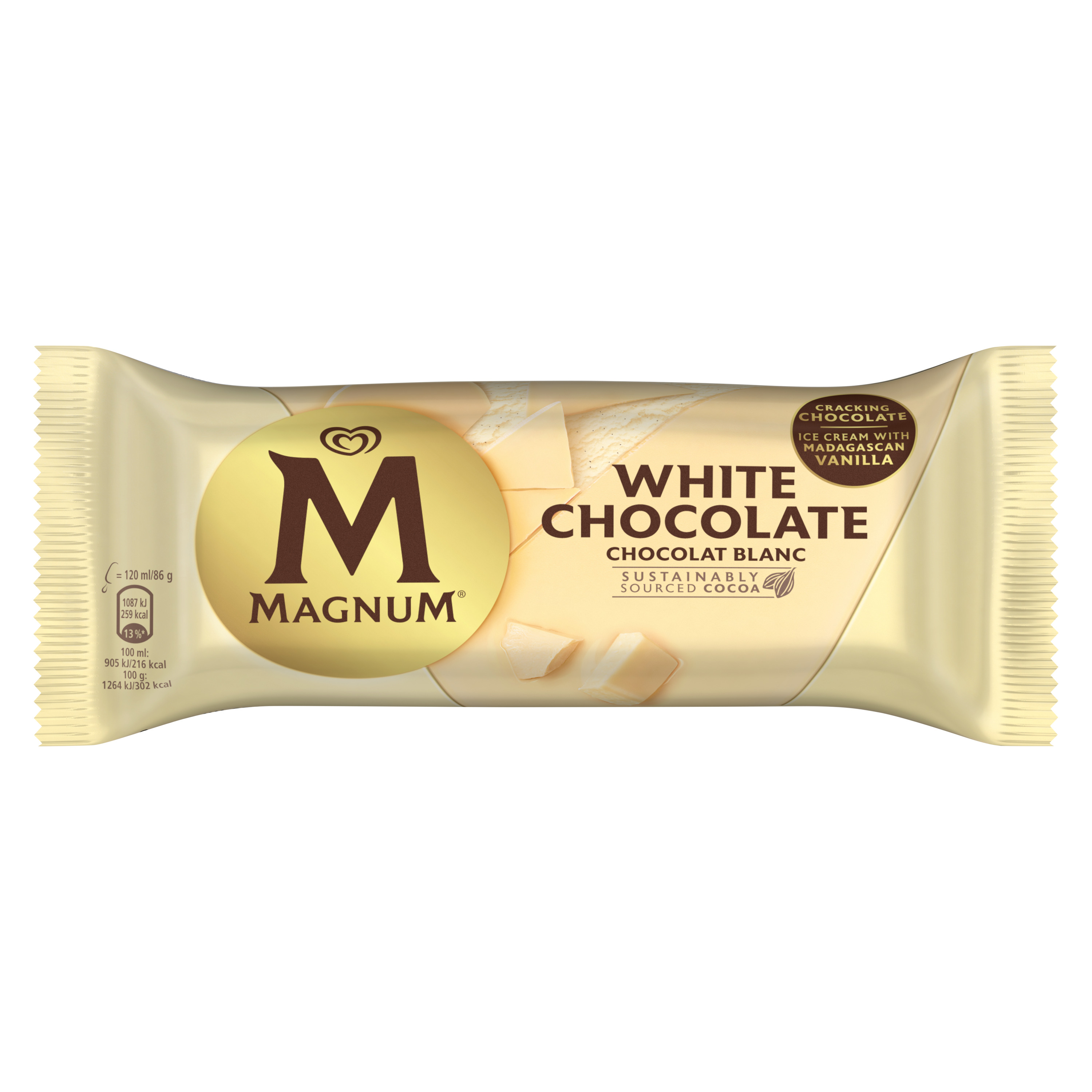 Magnum Chocolat Blanc est une onctueuse glace vanille enrobée d’un chocolat blanc craquant qui saura ravir vos papilles. Retrouvez le croquant Magnum dès la première bouchée, un enrobage chocolat blanc à la saveur inégalée qui dévoile une glace onctueuse. Parfum historique et emblématique de Magnum, ce bâtonnet gourmand Magnum Chocolat Blanc est un incontournable dans l’univers de la glace depuis plus de 25 ans. Une expérience de plaisir intense pour les adeptes du chocolat blanc. Pour profiter pleinement de leurs saveurs, sortez vos glaces Magnum du congélateur quelques minutes avant de les déguster. Magnum voit le jour en 1989 afin de satisfaire un désir de gourmandise activement recherché par les adultes. Le bâtonnet, un format jusque-là plutôt réservé aux enfants, se pare alors d’un enrobage au chocolat de grande qualité. Magnum devient ainsi la première marque de glaces entièrement consacrée aux plaisirs gourmands des adultes. Depuis, Magnum ne cesse de surprendre en élargissant chaque année son offre de nouveaux parfums. Aujourd’hui leader sur le marché de la glace, la marque offre une expérience toujours plus intense et premium. Les créations Magnum ? Irrésistibles de l’extérieur, onctueuses à l’intérieur, aussi savoureuses qu’intemporelles, elles ont su traverser les modes et s’imposer comme des saveurs incontournables. Leur signature ? Une forme emblématique, des parfums synonymes de plaisir à l’état pur et ce fameux chocolat craquant incomparable, qui n’a jamais failli à ses délicieuses promesses ! Magnum s’engage en certifiant la qualité et l’origine de ses ingrédients. 100 % du cacao du chocolat Magnum est cultivé de façon durable dans des plantations labélisées Rainforest Alliance, une ONG internationale qui agit sur 3 piliers : écologique, social et économique. À redécouvrir et à savourer, encore et toujours. Magnum, fidèle au plaisir.