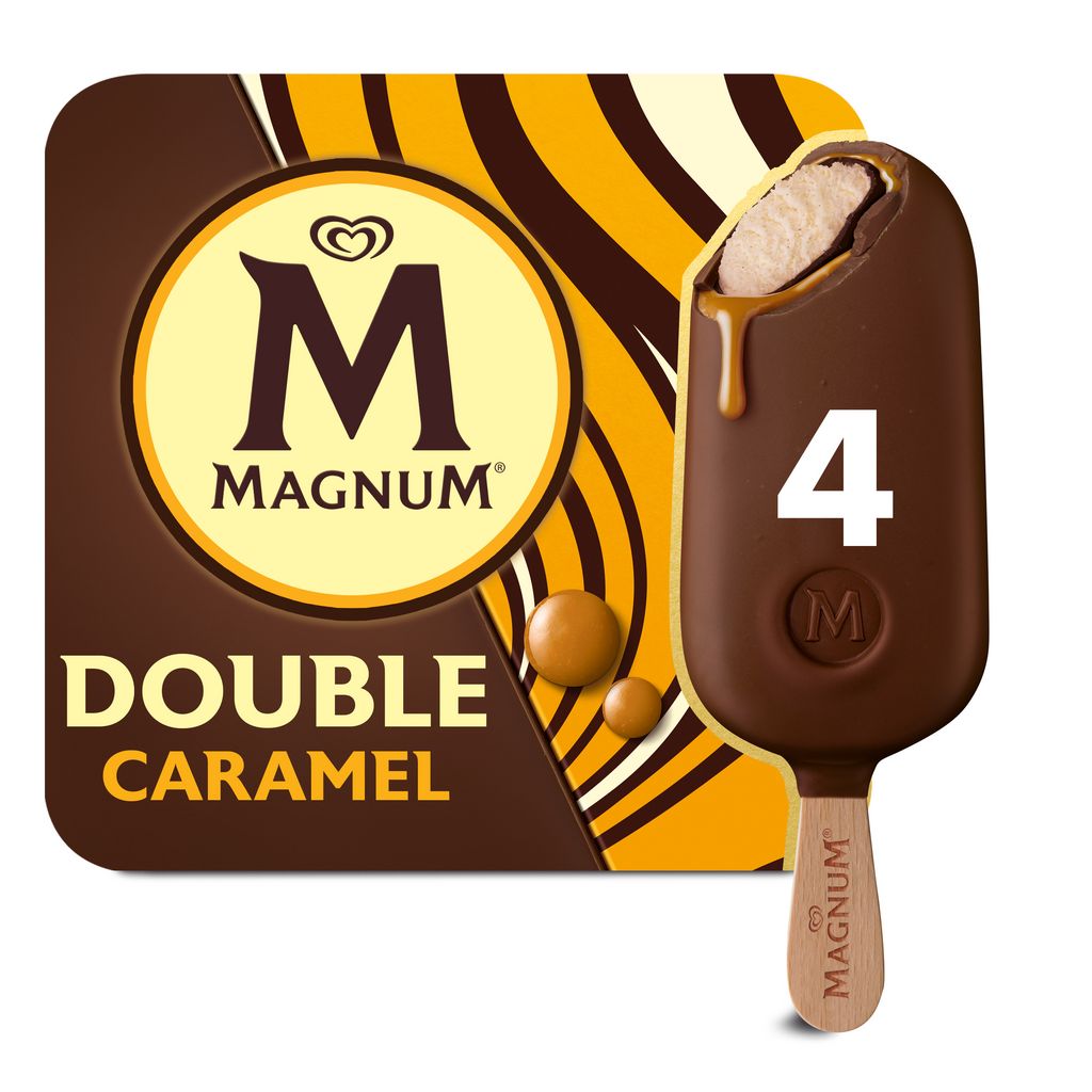 Découvrez le bâtonnet Magnum Double Caramel, une onctueuse glace à la vanille dans un double enrobage de chocolat au lait renfermant une sauce intense au caramel. Pour une expérience ultime de gourmandise au délicieux parfum de caramel avec le chocolat craquant Magnum. Libérez la bête, osez Magnum Double. La marque Magnum voit le jour en 1989 afin de satisfaire un désir de gourmandise activement recherché par les adultes. Le bâtonnet, un format jusque-là plutôt réservé aux enfants, se pare alors d’un enrobage au chocolat de grande qualité qui ne cesse de s'améliorer. Magnum devient ainsi la première marque de glaces entièrement consacrée aux plaisirs gourmands des adultes. Depuis, Magnum ne cesse de surprendre en élargissant son offre chaque année avec l'arrivée de nouveaux parfums. Aujourd’hui leader sur le marché de la glace et de la crème glacée, la marque offre une expérience toujours plus intense et haut de gamme. Les créations Magnum ? Irrésistibles de l’extérieur, onctueuses àl’intérieur, aussi savoureuses qu’intemporelles, elles ont su traverser les modes et s’imposer comme des saveurs incontournables. Leur signature ? Une forme iconique, des parfums synonymes de plaisir à l’état pur et ce fameux chocolat craquant incomparable, qui n’a jamais failli à ses délicieuses promesses ! Magnum s’engage également en certifiant la qualité et l’origine de ses ingrédients. Ainsi, 100 % du cacao des glaces Magnum est cultivé de façon durable dans des plantations vérifiées Rainforest Alliance, une ONG internationale qui agit sur 3 piliers : écologique, social et économique. À redécouvrir et à savourer, encore et toujours… Magnum, fidèle au plaisir. Ice cream with vanilla from Madagascar, coated in a fat reduced cocoa coating (8%), caramel sauce (19%) and milk chocolate (24%).