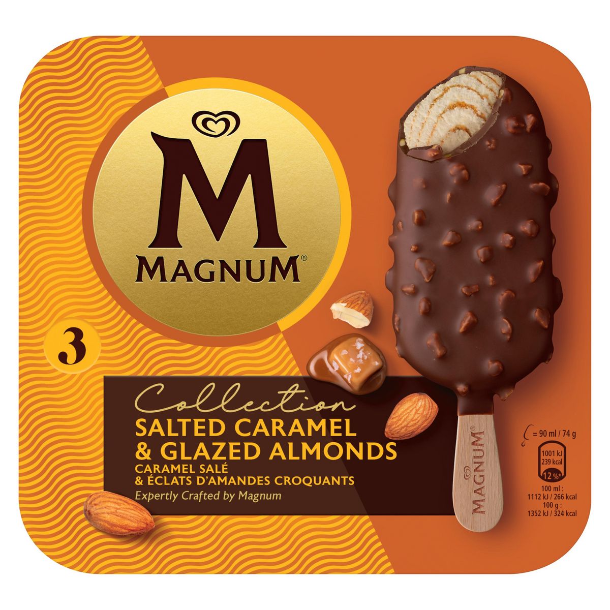 Glace bâtonnet Caramel Salé & Amandes Caramélisées Magnum, 3 glaces de 90 ml.