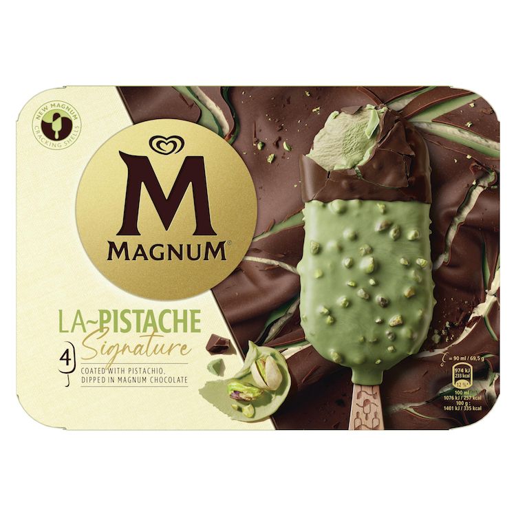 La nouvelle glace bâtonnet Magnum La Pistache présente un enrobage à base de pistache, recouvert de notre chocolat signature Magnum, avec des morceaux de pistaches caramélisées, pour une bouchée gourmande et croquante. Au cœur se trouve un gelato onctueux à la pistache, avec de la pâte de pistache, accompagné d'une glace parfumée à la pistache. L'expérience se termine par la pointe distinctive en chocolat Magnum, alliant des notes raffinées de pistache au plaisir iconique de Magnum. Retrouvez le craquant Magnum dès la première bouchée, un savoureux enrobage au chocolat qui dévoile une délicieuse glace. Pour profiter pleinement des saveurs, sortez votre glace Magnum du congélateur quelques minutes avant de déguster. Magnum voit le jour en 1989 afin de satisfaire un désir de gourmandise activement recherché par les adultes. Le bâtonnet se pare alors d'un enrobage au chocolat de grande qualité. Depuis, Magnum ne cesse de surprendre en élargissant chaque année son offre de nouveaux parfums. Aujourd'hui leader sur le marché de la glace, la marque offre une expérience toujours plus intense et premium. Les créations Magnum ? Irrésistibles de l'extérieur, onctueuses à l'intérieur, aussi savoureuses qu'intemporelles, elles ont su traverser les modes et s'imposer comme des saveurs incontournables. Leur signature ? Une forme emblématique, des parfums synonymes de plaisir et ce fameux chocolat craquant incomparable, qui n'a jamais failli à ses délicieuses promesses ! À redécouvrir et à savourer, encore et toujours. Magnum, fidèle au plaisir.