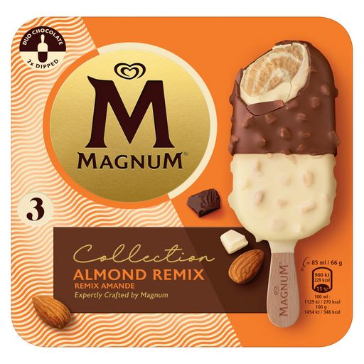 Un délicieux remix des éléments iconiques d'un Magnum : une onctueuse glace parfum amande avec un tourbillon de glace vanille, enrobés dans du chocolat blanc avec des morceaux d'amandes et à nouveau enrobés à moitié de chocolat au lait pour une expérience inédite. Elle allie la douceur de la glace à la vanille de Madagascar avec le croquant des amandes cultivées sous le soleil de la Californie. Magnum réinvente son parfum historique et emblématique Magnum Amande, avec un nouveau double enrobage et un bâtonnet encore plus gourmand. Le plaisir est là, saisissez-le ! Pour une meilleure dégustation, sortez vos glaces Magnum du congélateur quelques minutes avant de profiter de leurs saveurs. Pour les amateurs de chocolat, découvrez également la glace Magnum Intense Dark, une glace au chocolat au lait, enrobée d'une couche épaisse de chocolat noir craquant composée à 70% de cacao. Magnum voit le jour en 1989 afin de satisfaire un désir de gourmandise activement recherché par les adultes. Le bâtonnet, un format jusque-là plutôt réservé aux enfants, se pare alors d'un enrobage au chocolat de grande qualité. Aujourd'hui leader sur le marché de la glace, la marque offre une expérience toujours plus intense et premium. Les créations Magnum ? Irrésistibles de l'extérieur, onctueuses à l'intérieur, aussi savoureuses qu'intemporelles, elles ont su traverser les modes et s'imposer comme des saveurs incontournables. Leur signature ? Une forme emblématique, des parfums synonymes de plaisir à l'état pur et ce fameux chocolat craquant incomparable, qui n'a jamais failli à ses délicieuses promesses ! À redécouvrir et à savourer, encore et toujours. Magnum, le plaisir est là, saisissez-le !