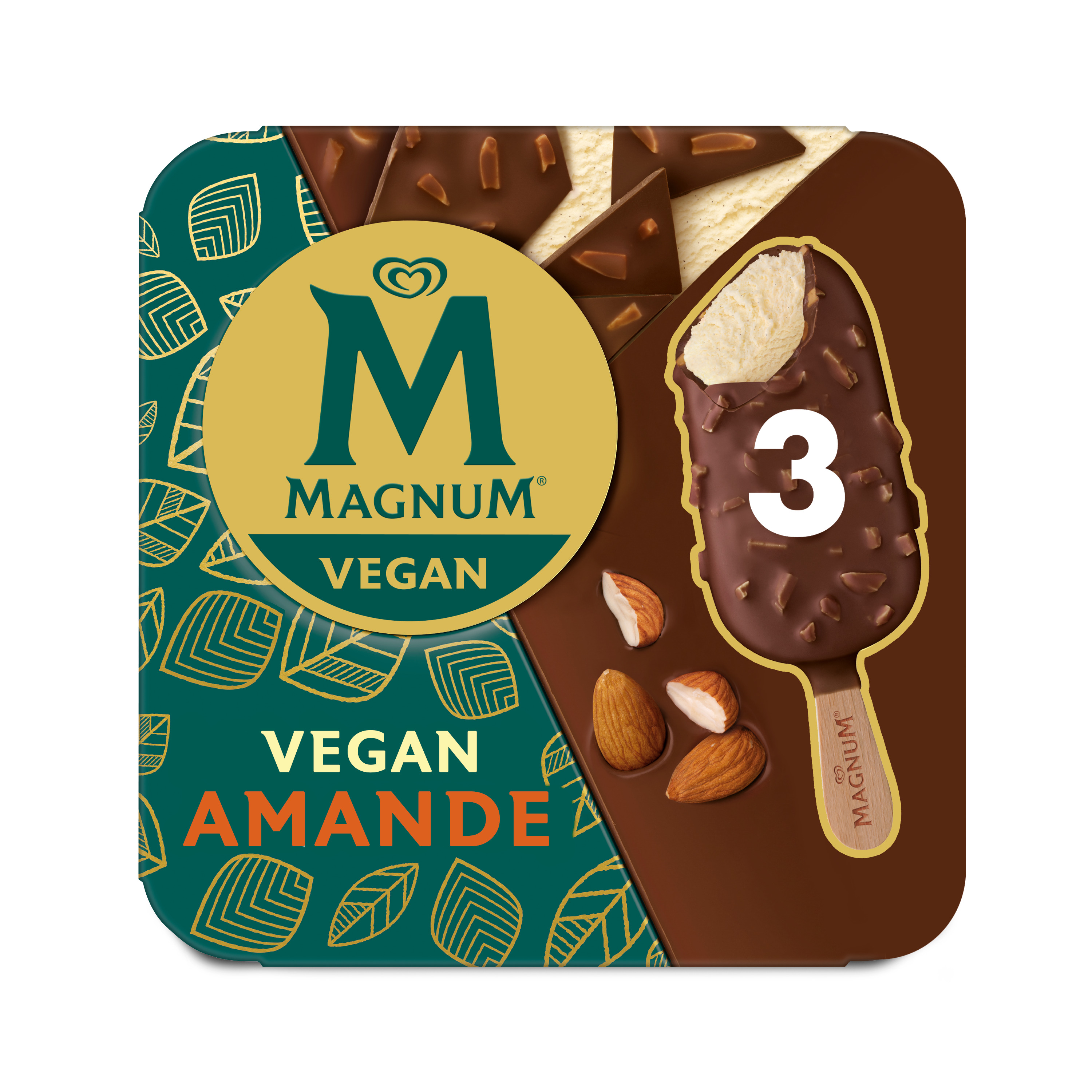 Le bâtonnet Magnum Amande Vegan, c'est une onctueuse glace végétale à la vanille, enrobée d'une couche de chocolat craquant et d'éclats d'amandes