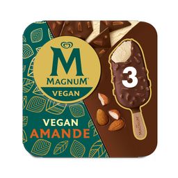 Découvrez le bâtonnet Magnum Amande Vegan, une onctueuse glace végétale à la vanille, enrobée de chocolat craquant et d'éclats d'amande. La version vegan de notre célèbre glace Magnum Amande, pour les amateurs de plaisir sans produits laitiers.