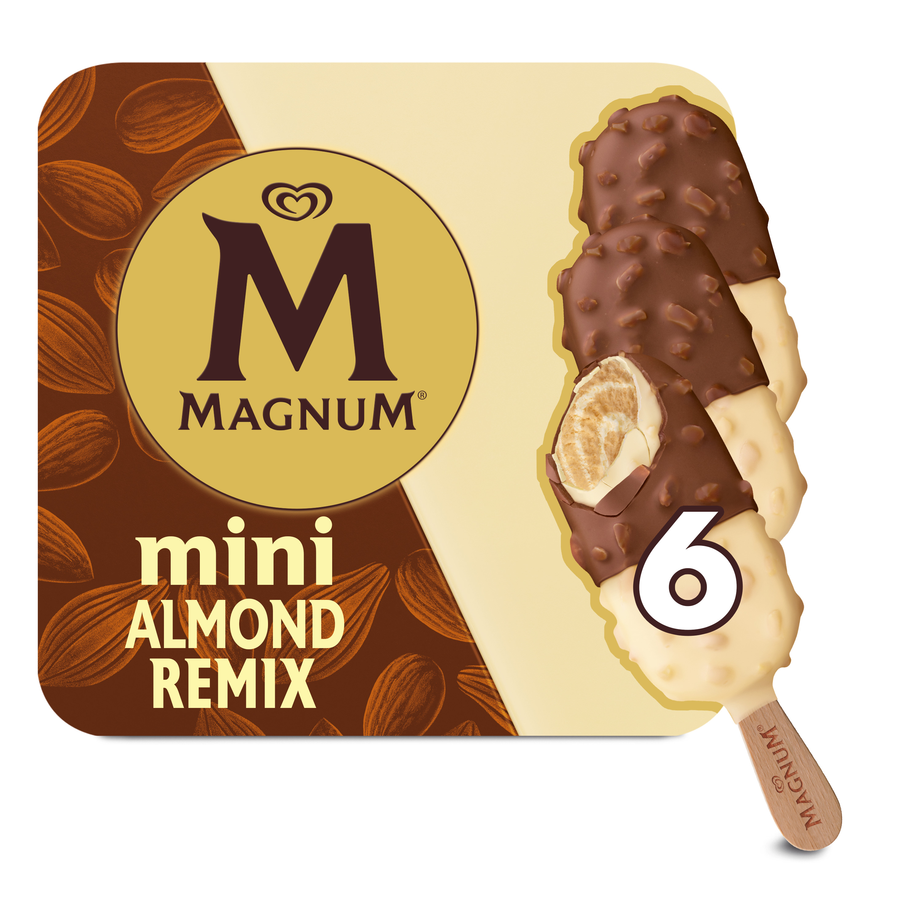 Glace parfum amande et glace vanille enrobage chocolat blanc (29%) avec des morceaux d'amandes (3%) et second enrobage chocolat au lait (7%).