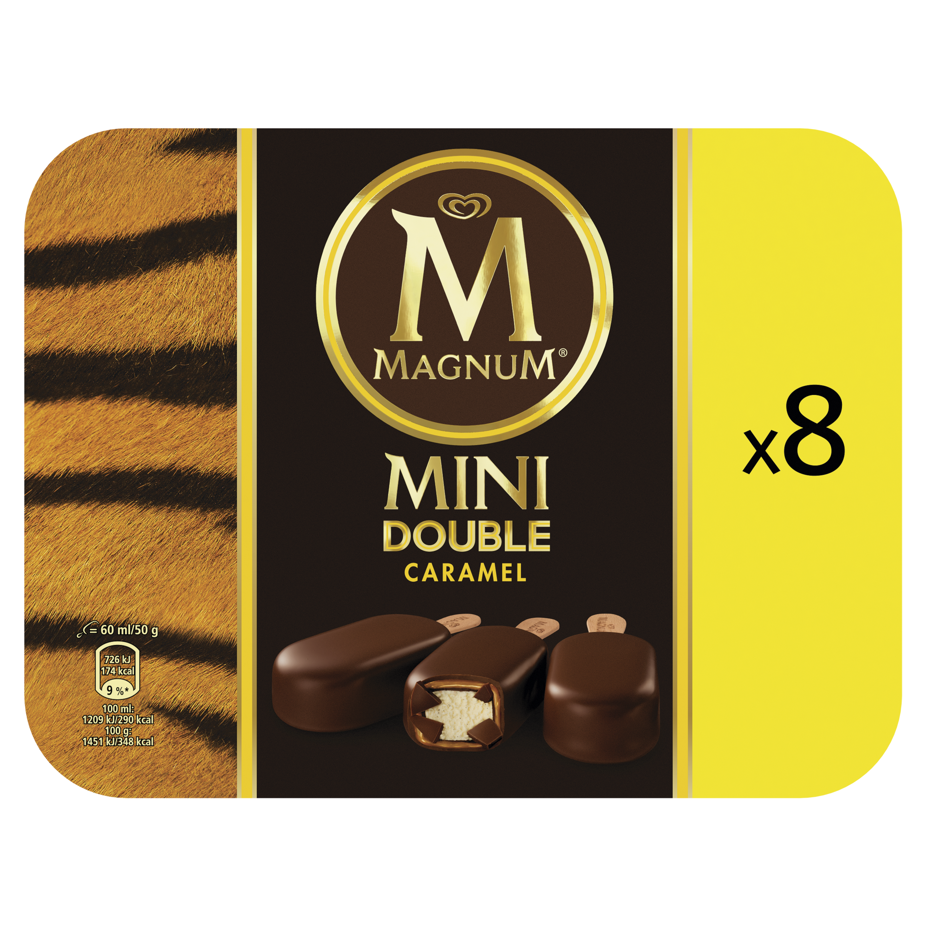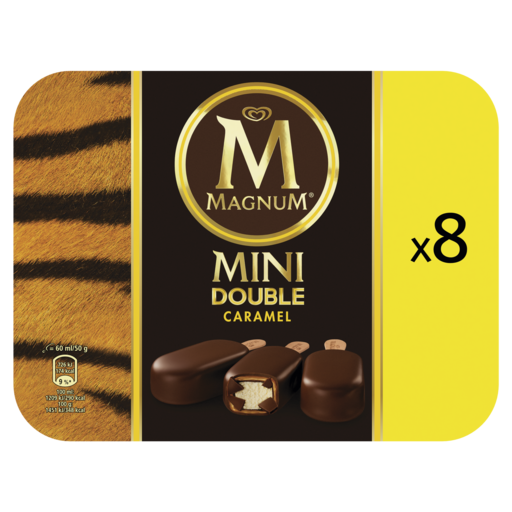 8 glaces Magnum Double Caramel en format mini. Magnum Double Caramel c'est une glace Vanille dans un double enrobage au cacao renfermant une sauce intense au Caramel.