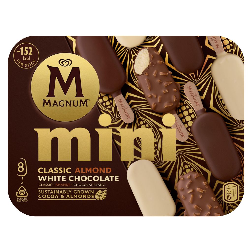 Succombez à toutes vos envies avec la boîte de bâtonnets Magnum Classic, Amande et Chocolat blanc. Trois glaces incontournables de la marque sont réunies pour satisfaire tous les goûts. Magnum Classic, Magnum Amande et Magnum Chocolat Blanc : réveillez vos papilles avec cet assortiment de glaces savoureuses. Croquez dans la couche de chocolat au lait aux éclats d'amandes du Magnum Amande qui dévoile une glace vanille onctueuse. Redécouvrez la délicieuse glace vanille enrobée d'une couche de chocolat au lait craquant du Magnum Classique. Fondez de plaisir avec le Magnum Chocolat Blanc et sa couche de chocolat blanc croquante. Sortez les glaces Magnum du congélateur quelques minutes avant de les déguster afin de profiter pleinement de leurs saveurs. Magnum voit le jour en 1989 pour satisfaire un désir de gourmandise activement recherché par les adultes. Le bâtonnet, un format jusque-là plutôt réservé aux enfants, se pare alors d'un enrobage au chocolat de grande qualité. Aujourd'hui leader sur le marché de la glace, la marque offre une expérience toujours plus intense et premium. Les créations Magnum ? Irrésistibles de l'extérieur, onctueuses à l'intérieur, aussi savoureuses qu'intemporelles, elles ont su traverser les modes et s'imposer comme des saveurs incontournables. Leur signature ? Une forme emblématique, des parfums synonymes de plaisir à l'état pur et ce fameux chocolat craquant incomparable, qui n'a jamais failli à ses délicieuses promesses ! À redécouvrir et à savourer, encore et toujours. Magnum, le plaisir est là, saisissez-le !
